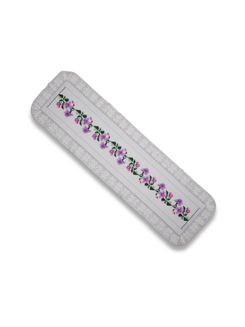 Seher Ayral tarafından modernize edilmiş, eski oda takımı parçalarının birleşimiyle oluşturulmuş zarif bir aksesuar. Alpaga pamuklu keten üzerine mor ve yeşil astragan nakışıyla işlenmiş şık bir dekoratif örtü.