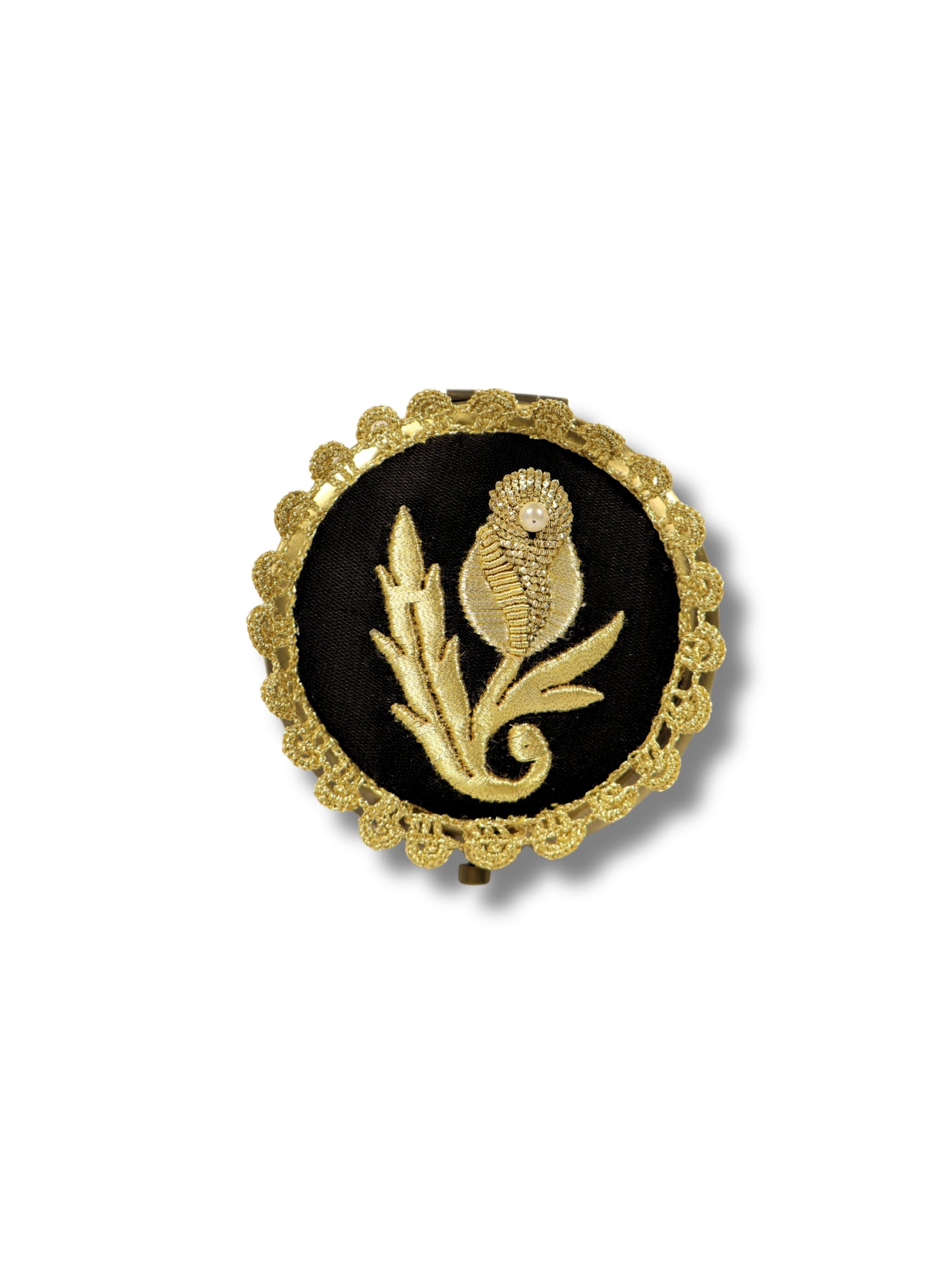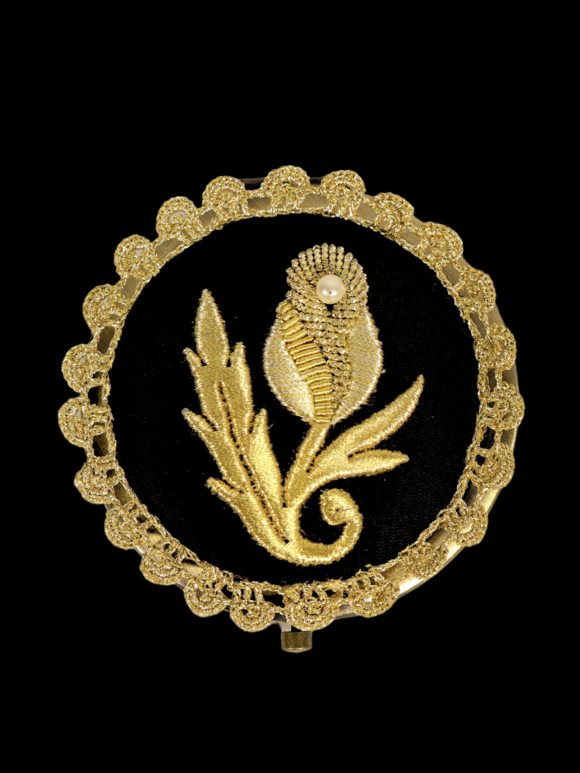 Zarif el işçiliğiyle hazırlanmış bu özel tasarım, siyah saten kumaş üzerine elde sim sırma tekniğiyle işlenmiş çiçek motifi ile süslenmiştir. Motifin merkezine yerleştirilen inci detayı, esere klasik bir zarafet kazandırırken, kenarları gold sim iplikle elde örülmüş dantel ile çevrelenmiştir.