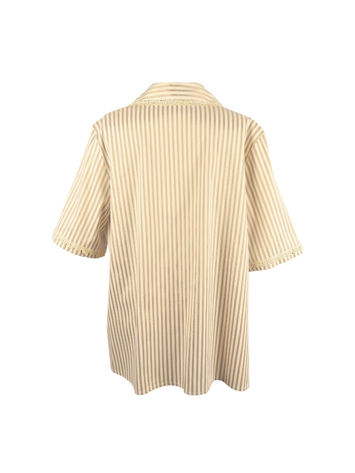 Crafted from striped jacquard fabric in off-white and champagne hues, this V-neck shirt exudes subtlety in its simple form. A lace stripe, fashioned like a man's collar, is hand-crocheted along the front placket. The crest on the left, also crocheted, adds a touch of originality and handmade elegance to the shirt.