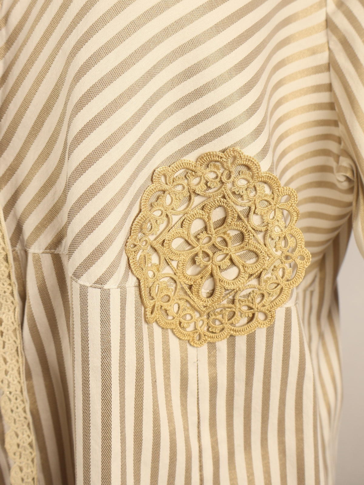 Jacquard cotton fabric (off white & champagne stripes), handmade crochet lace, crocheted crest