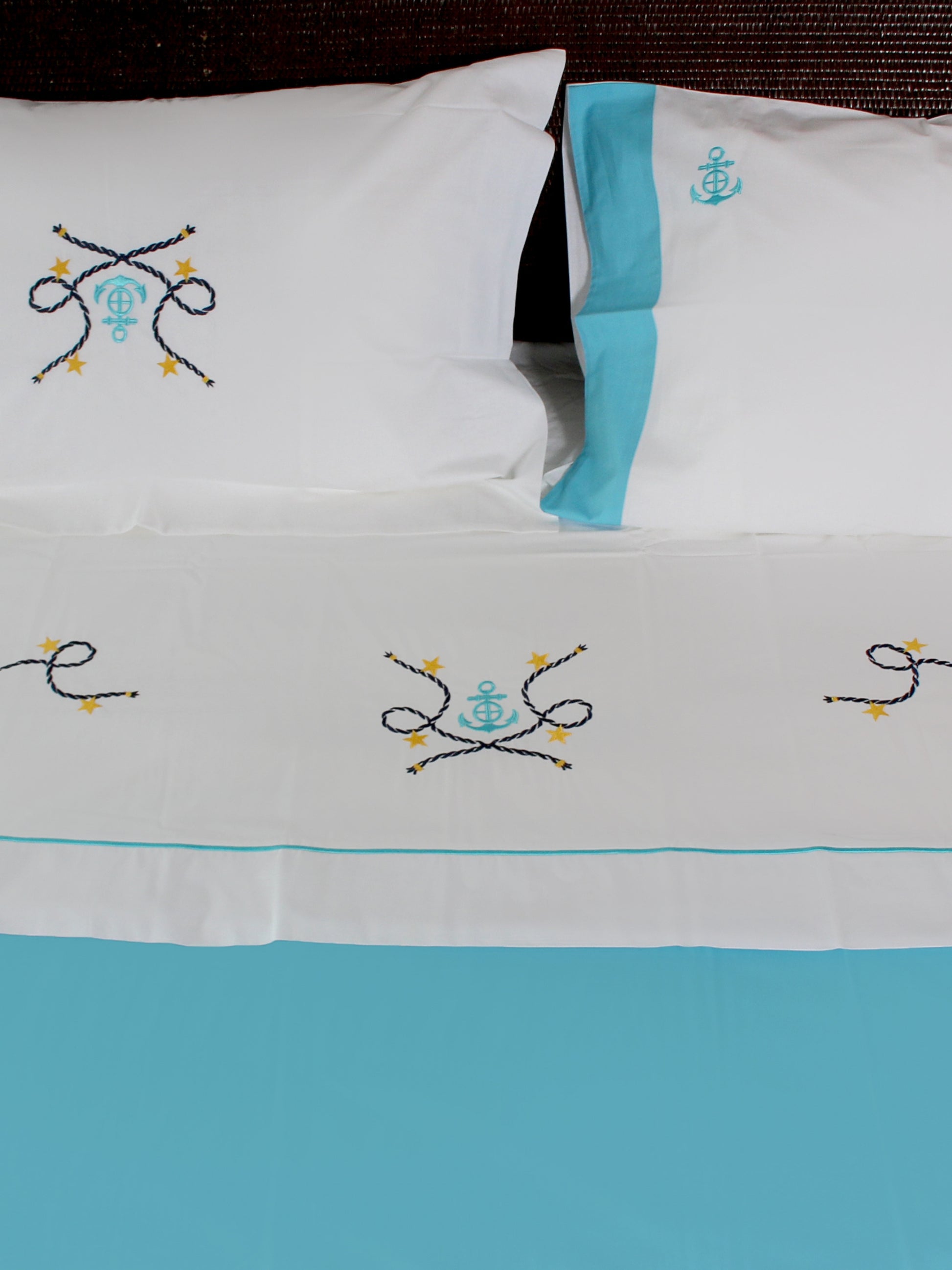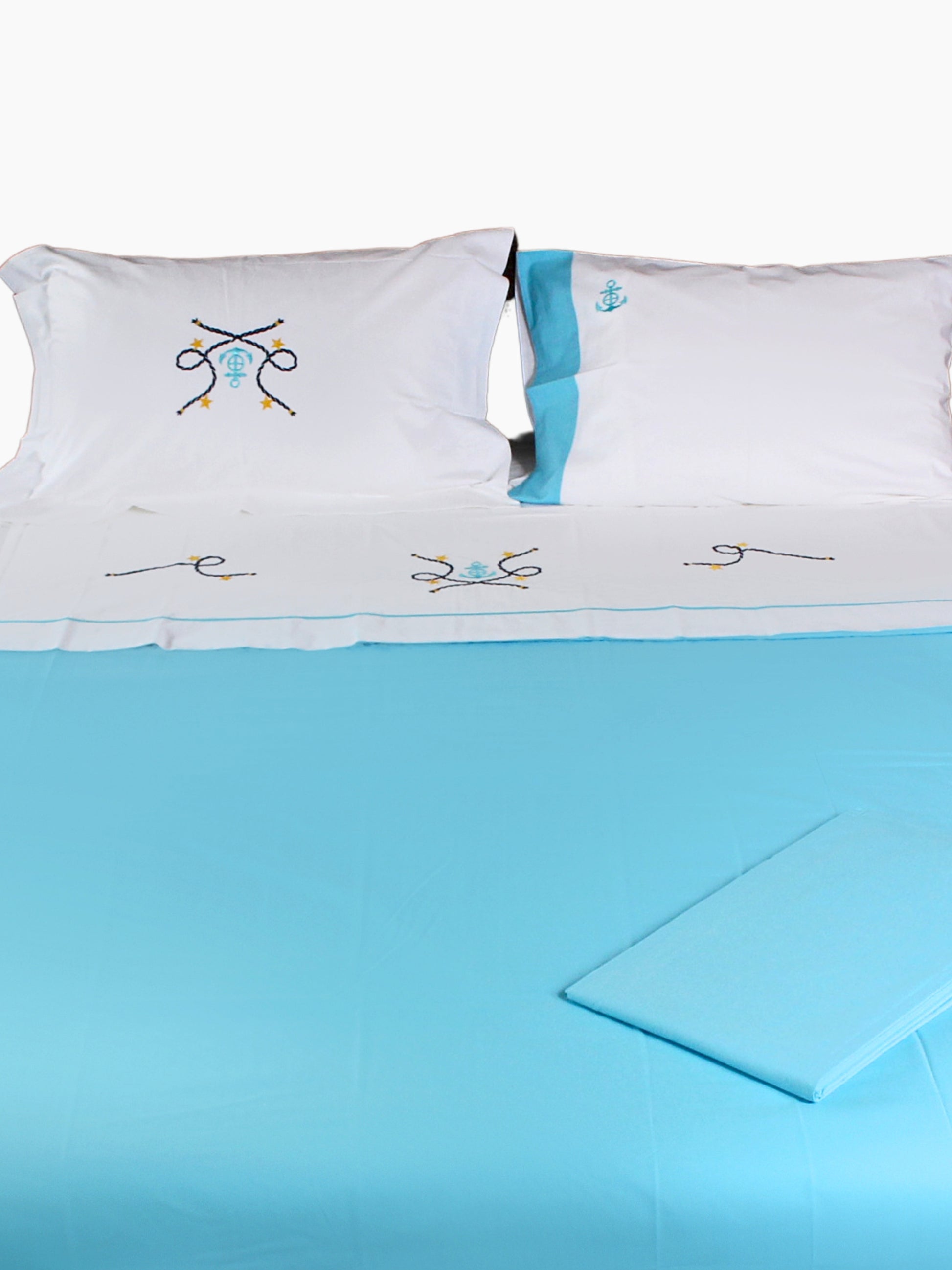 Pamuklu ketenden üretilmiş bu özel nevresim takımı; mavi ve beyaz tonlarda işlenmiş çapa ve halat motifleriyle deniz estetiğini evinize taşır. Zarif nakış detaylarıyla hem çeyiz hazırlıklarında hem de günlük kullanımda spor-şık bir alternatif sunar. Tek tasarım ve butik üretimdir.