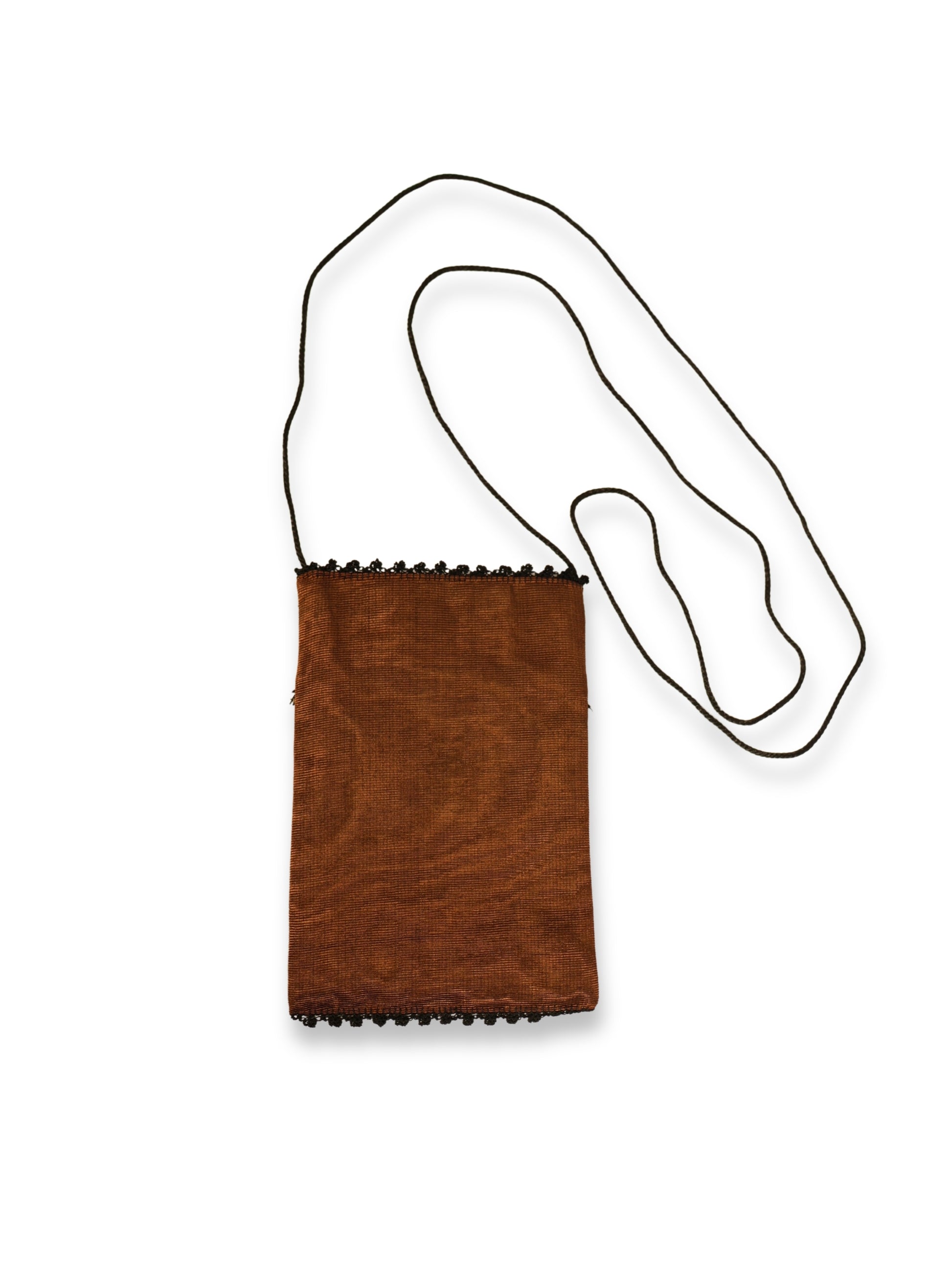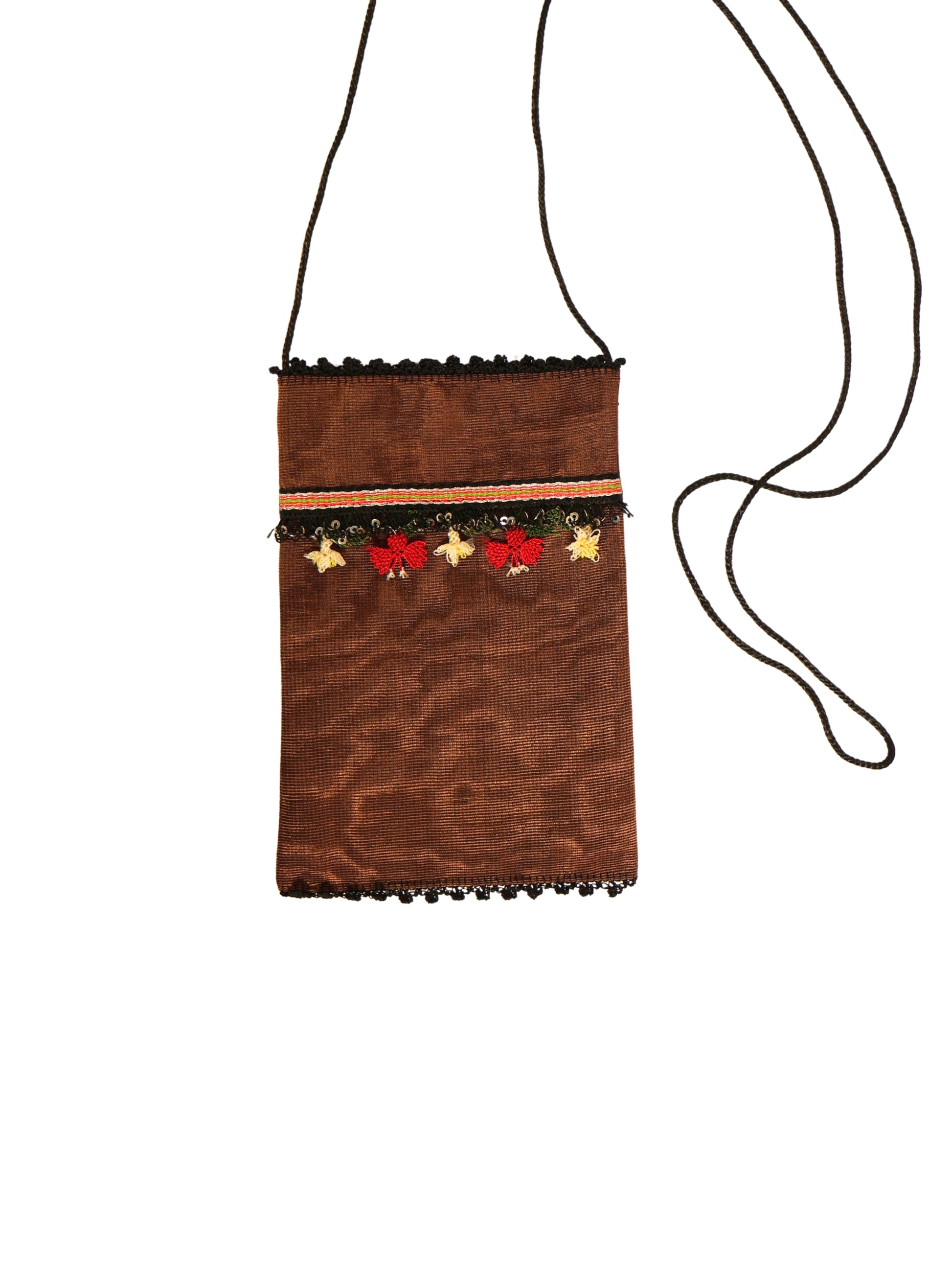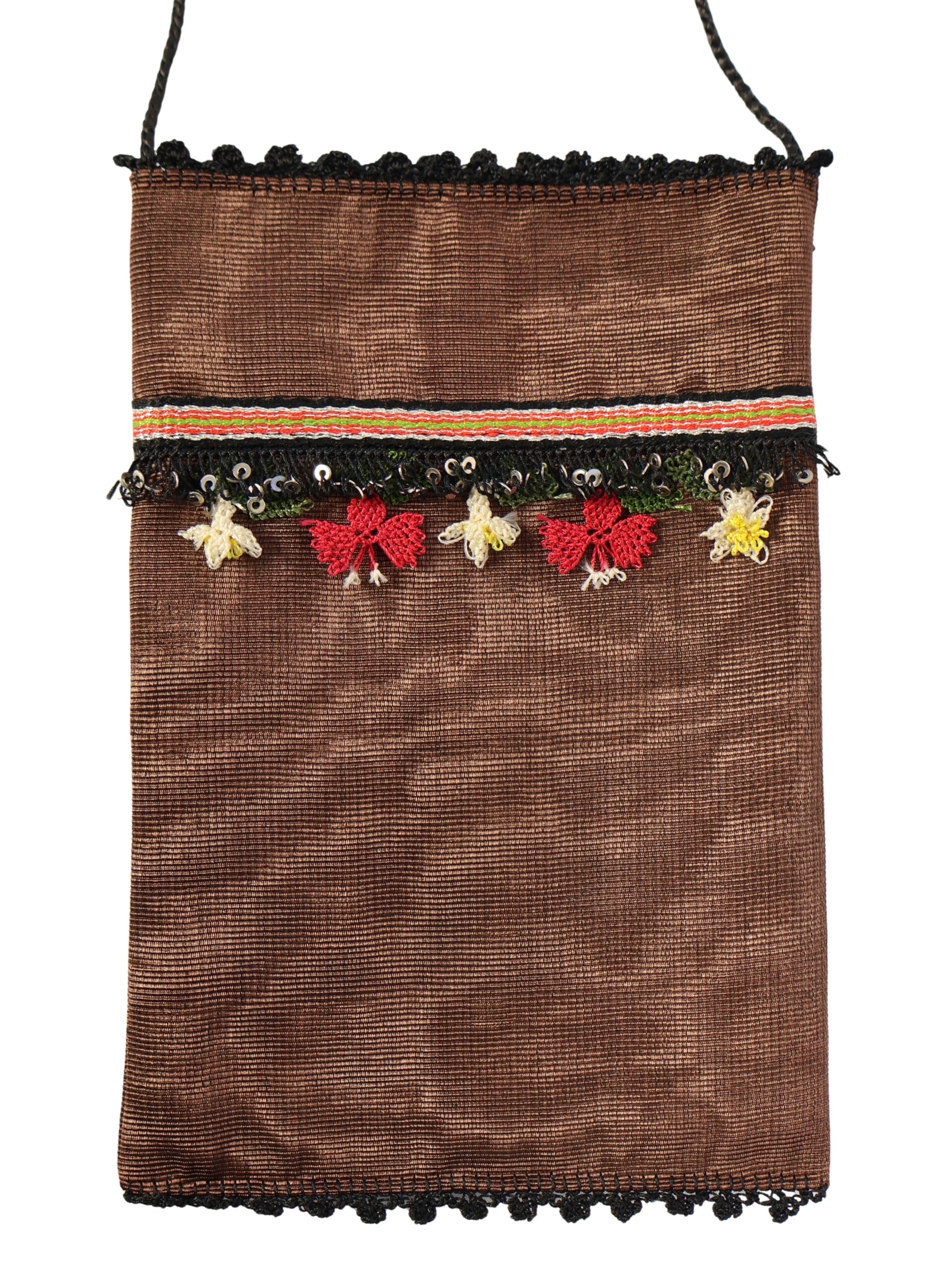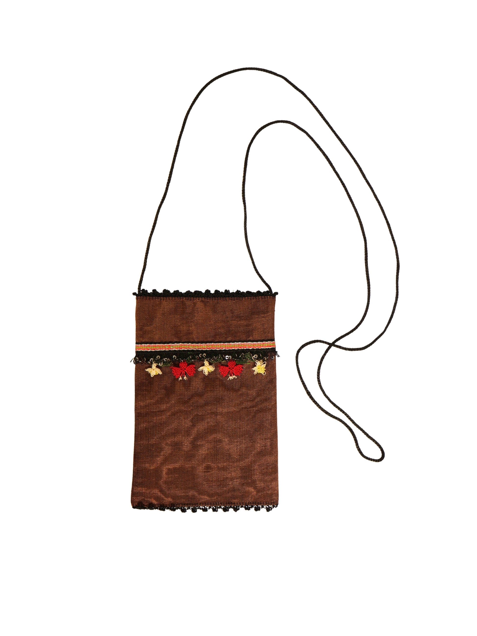 Kahverengi ipek fay kumaştan dikdörtgen formda hazırlanmış bu el yapımı kese, geleneksel el sanatlarının zarif bir bileşimidir. Ön yüzü, elde çalışılmış iğne oyası çiçek motifleriyle süslenmiş; kenarları ise siyah çelik gümüş payetlerle yapılan filkete işiyle zenginleştirilmiştir. Renkli harç detaylarıyla hareket kazandırılan tasarımın ağız kısmı ve alt kenarı, siyah tonda ipek iplikle elde tığlanmıştır. Sap kısmı da aynı renk ipek kordonla bütünlük içinde hazırlanmıştır. İçi ipek astarla kaplanmış olan bu özgün parça, ustalıkla işlenmiş zarafetiyle dikkat çeker.