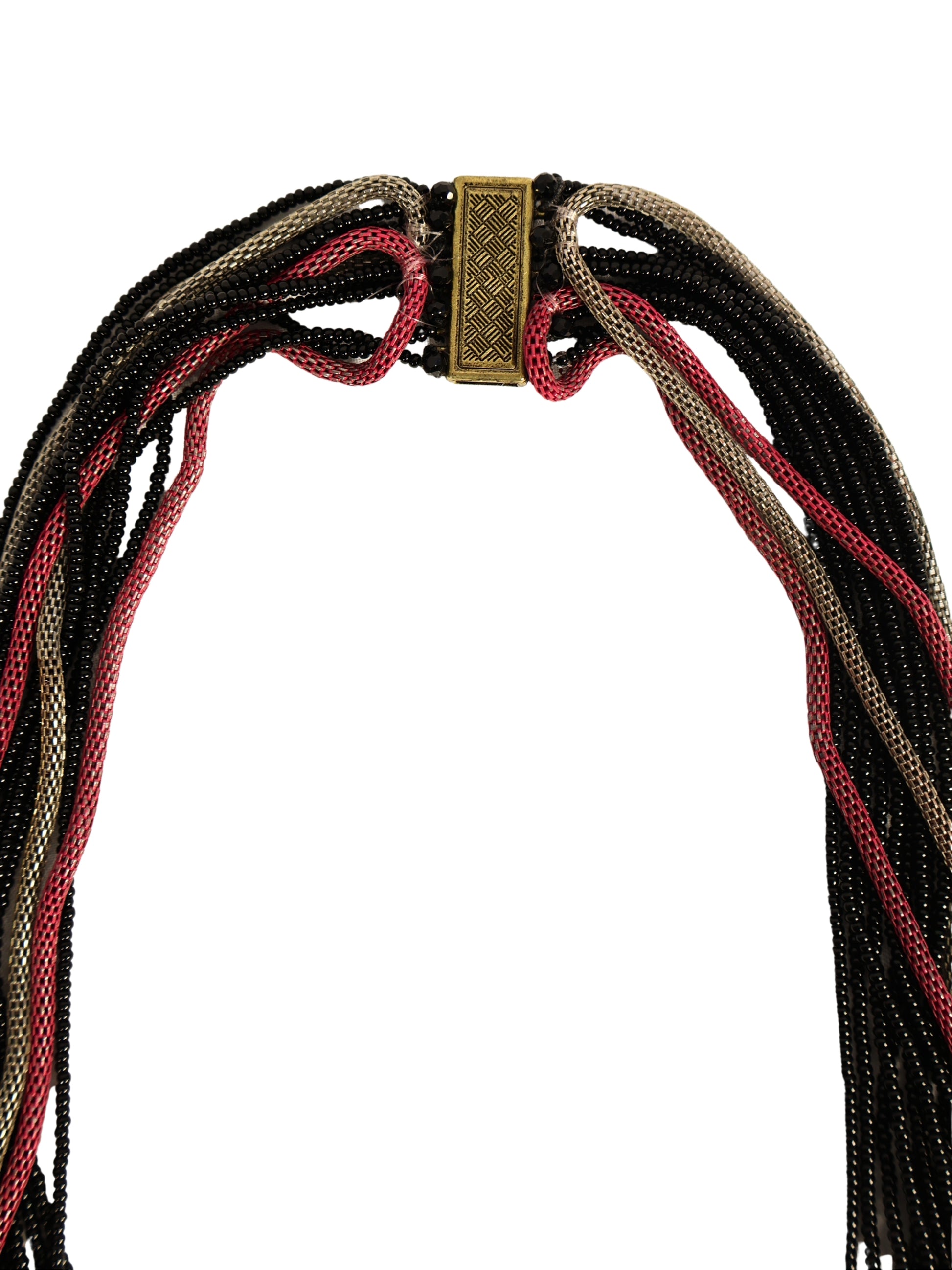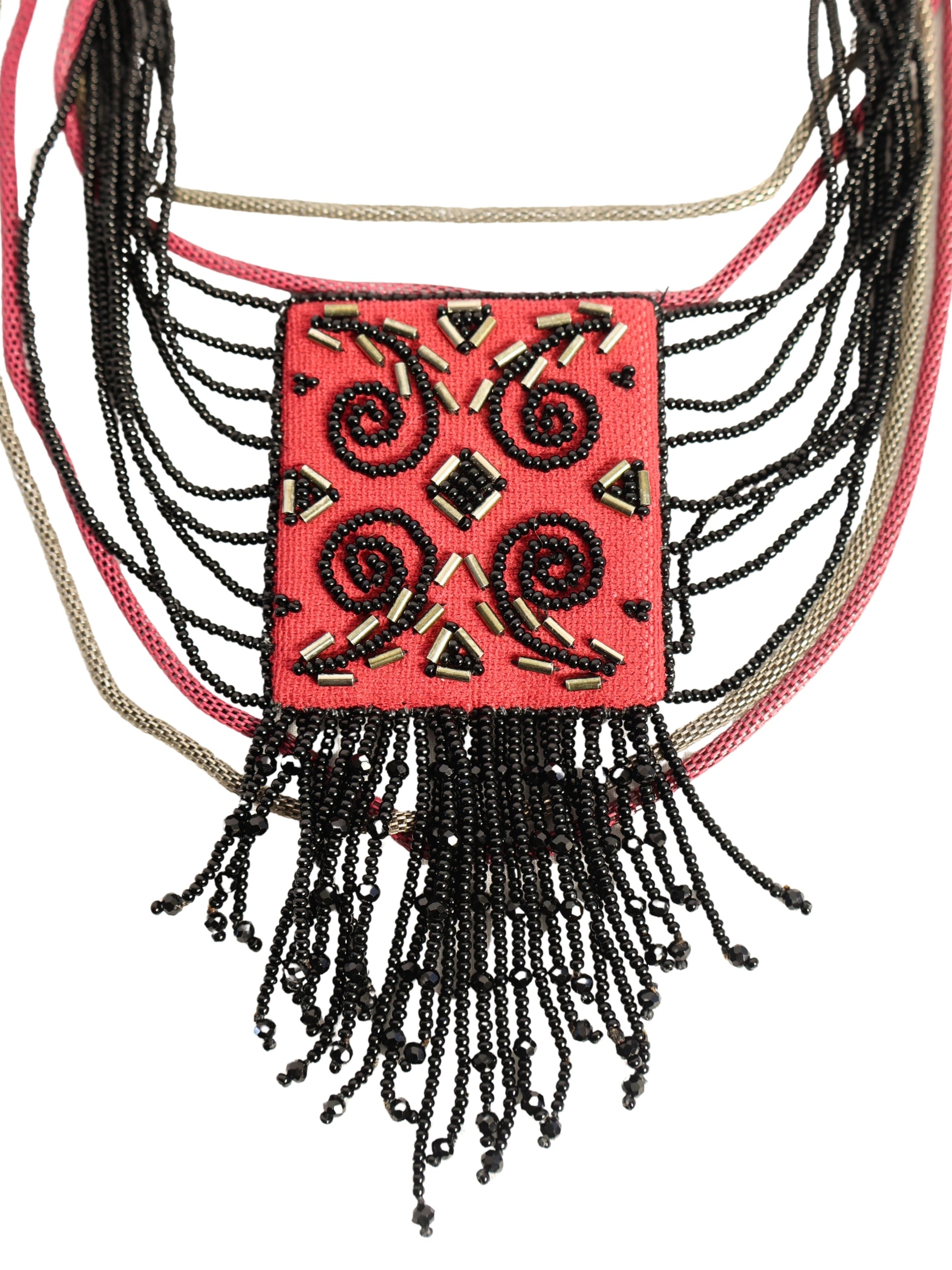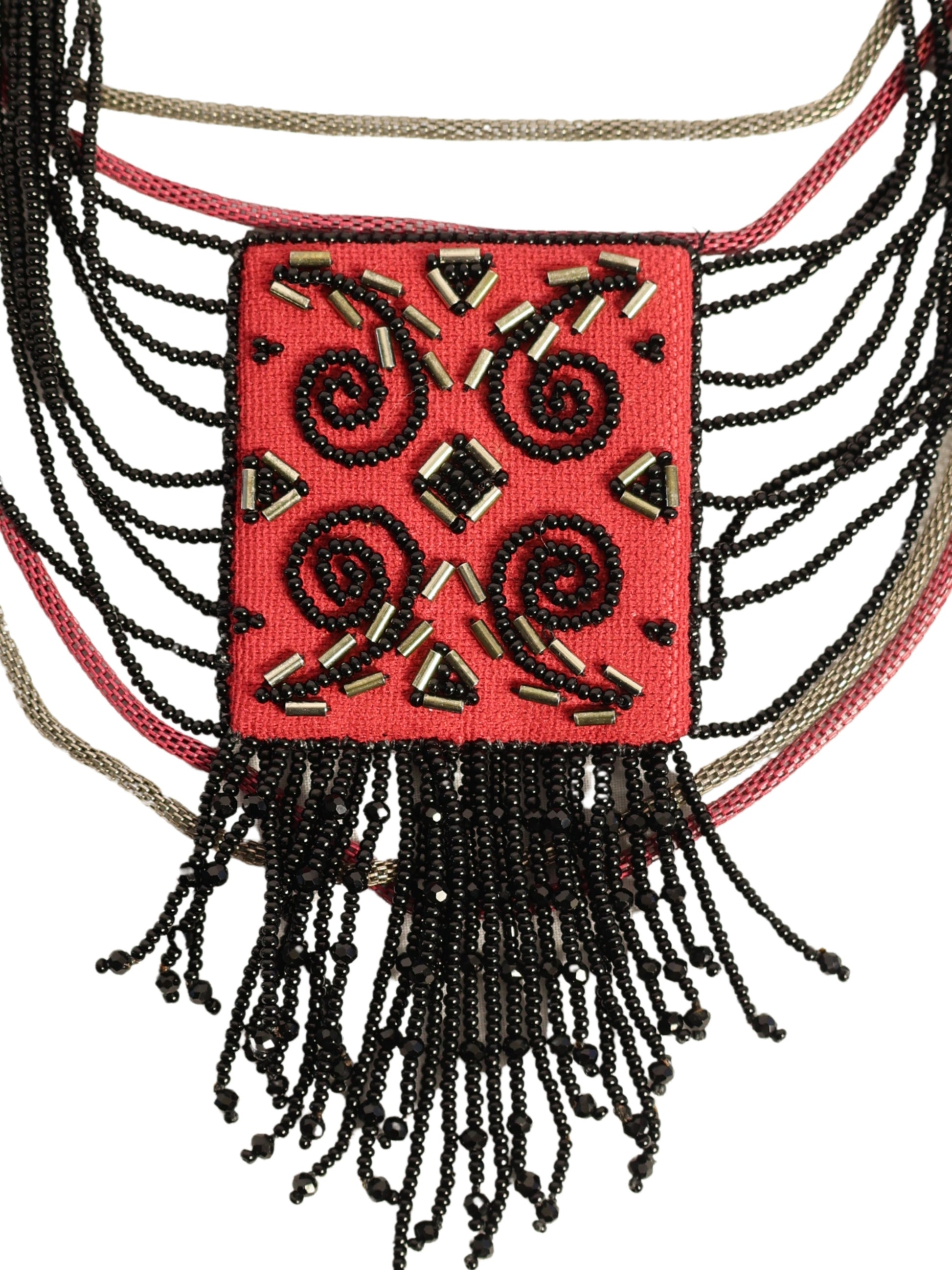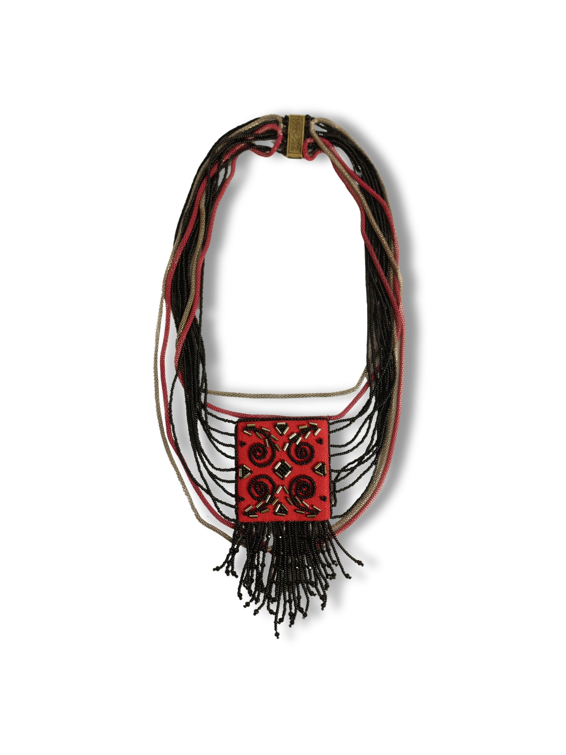 Motif kompozisyonuna farklı tonlarda boncuklar eklenerek kolyeye hareket ve derinlik kazandırılmış, aralarına yerleştirilen zincir detaylarıyla tasarım tamamlanmıştır. Geleneksel motif yorumunu modern aksesuar formuyla birleştiren özgün ve dikkat çekici bir parçadır.