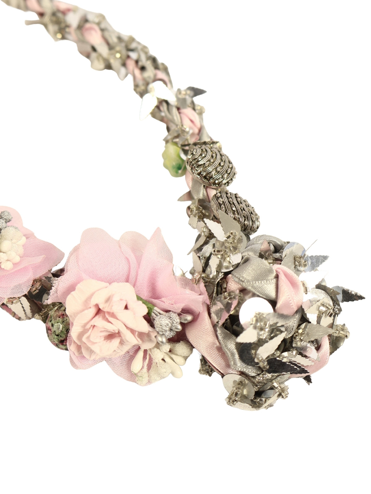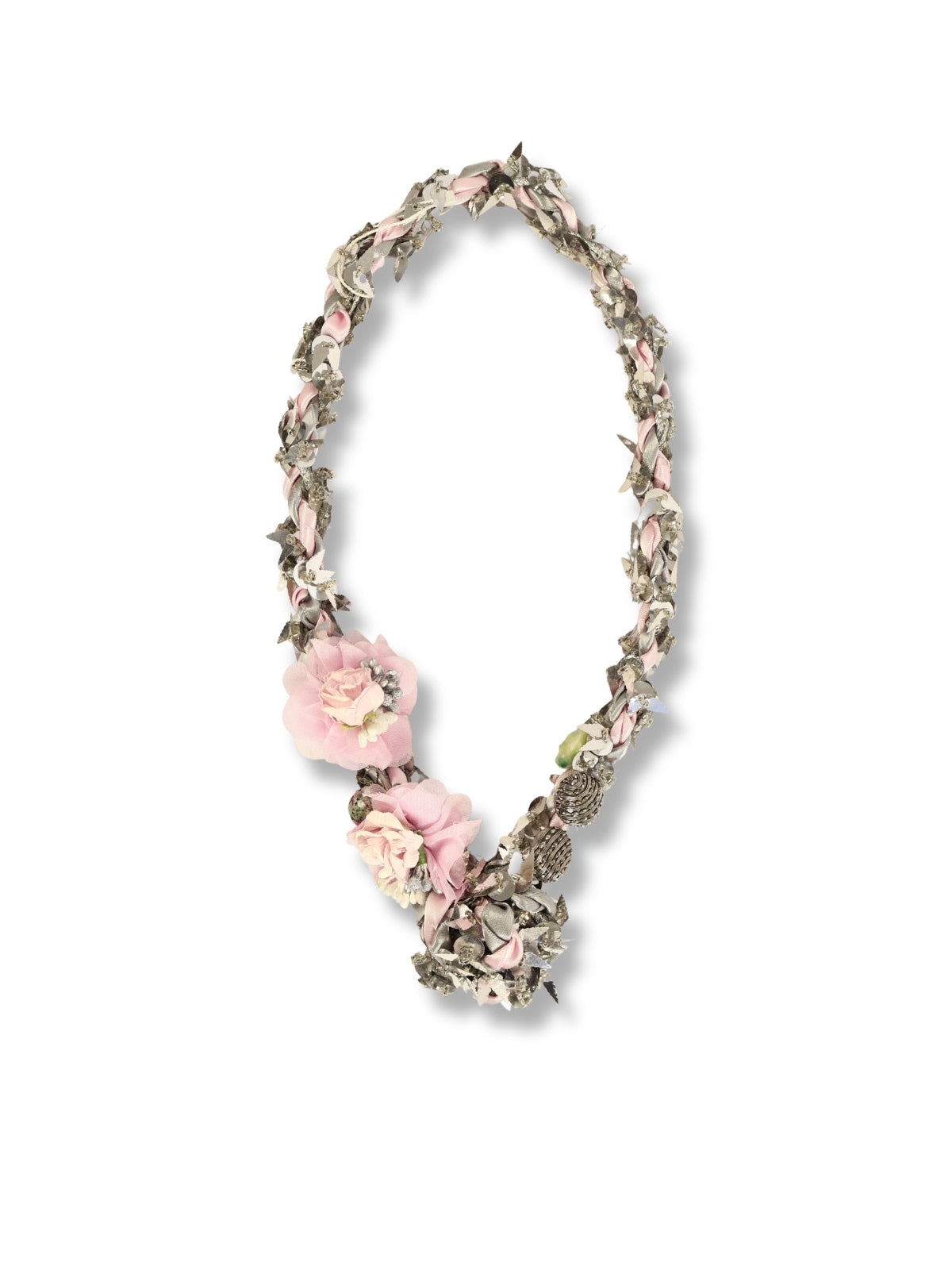 Silk ribbon (pink & grey), silver sequined garland, flower detail, special stone-shaped pendant