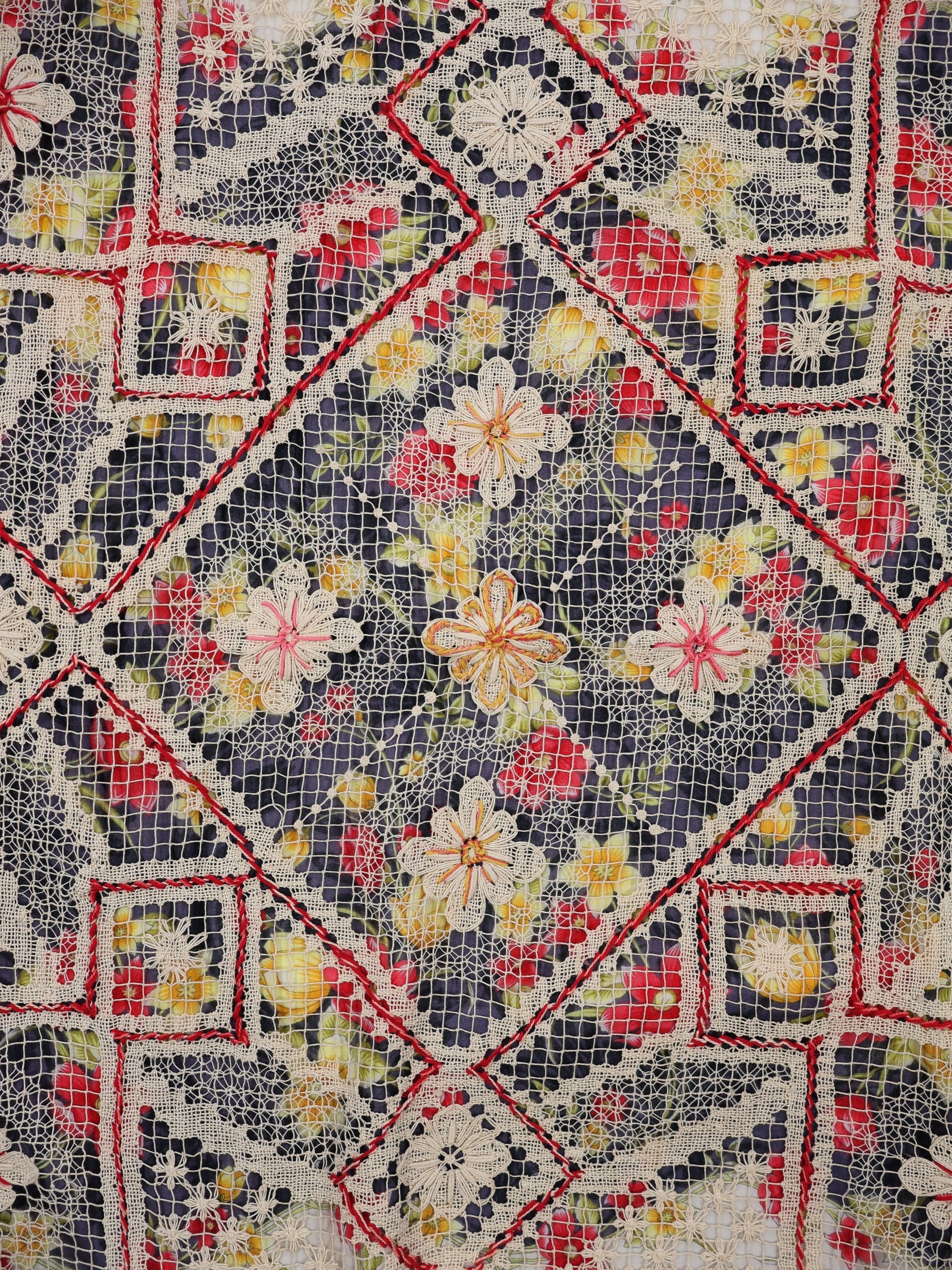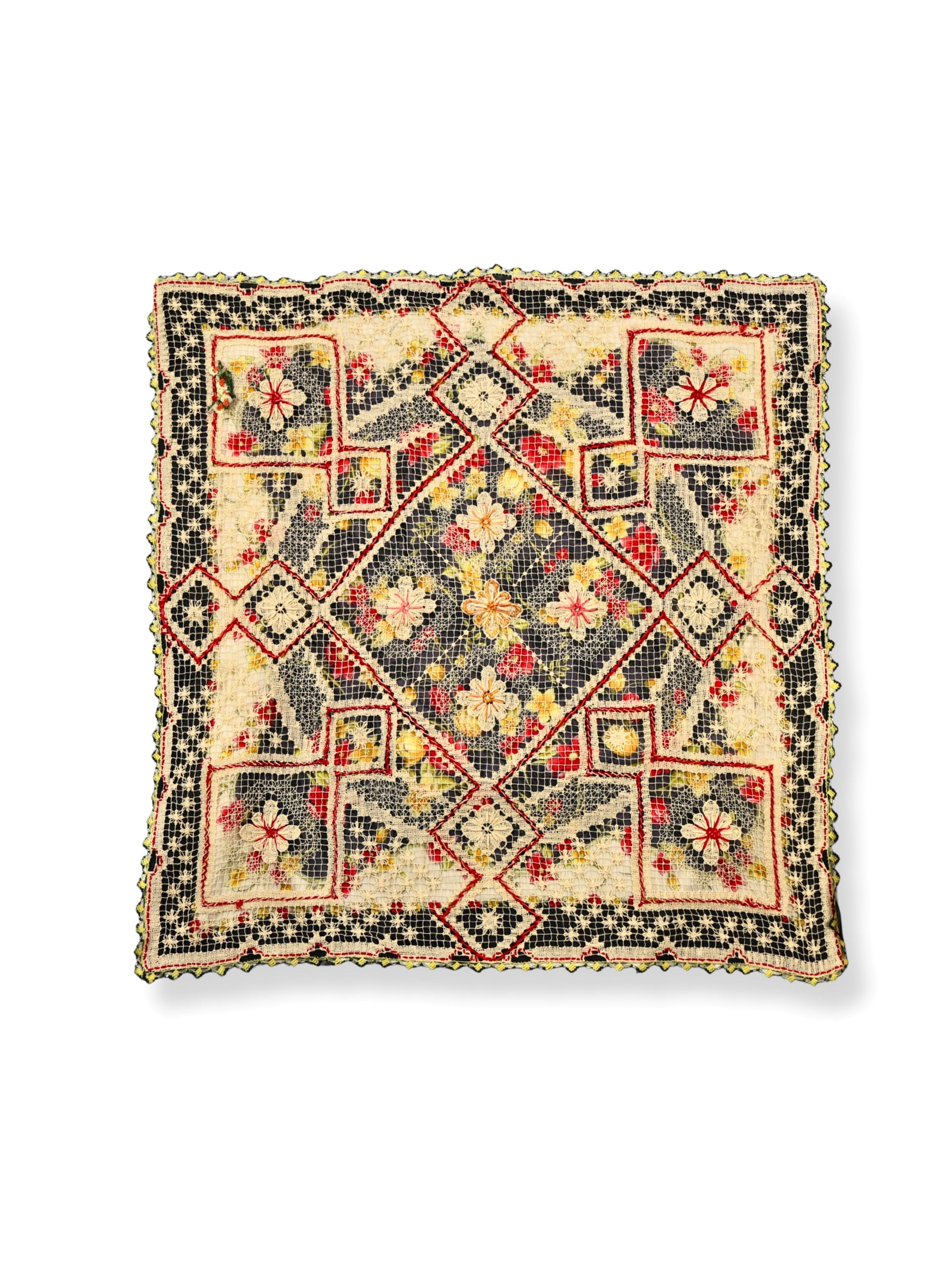 1990’lı yıllarda makinede özel olarak tasarlanmış Portekiz desenli ekru dantel, antika bir yazmayla birleştirilerek modern bir yorumla yeniden tasarlanmıştır. Renkli ve desenli yazma, aynı tonlardaki ipliklerle dört tarafından elde tığlanmış; dantel bu yüzey üzerine duble formda monte edilmiştir. Dantelin yüzeyi, yazmanın renk tonlarına uyumlu ipliklerle elde süslenmiş, yazma tarafı ise renkli boncuklarla zarif biçimde tamamlanmıştır.