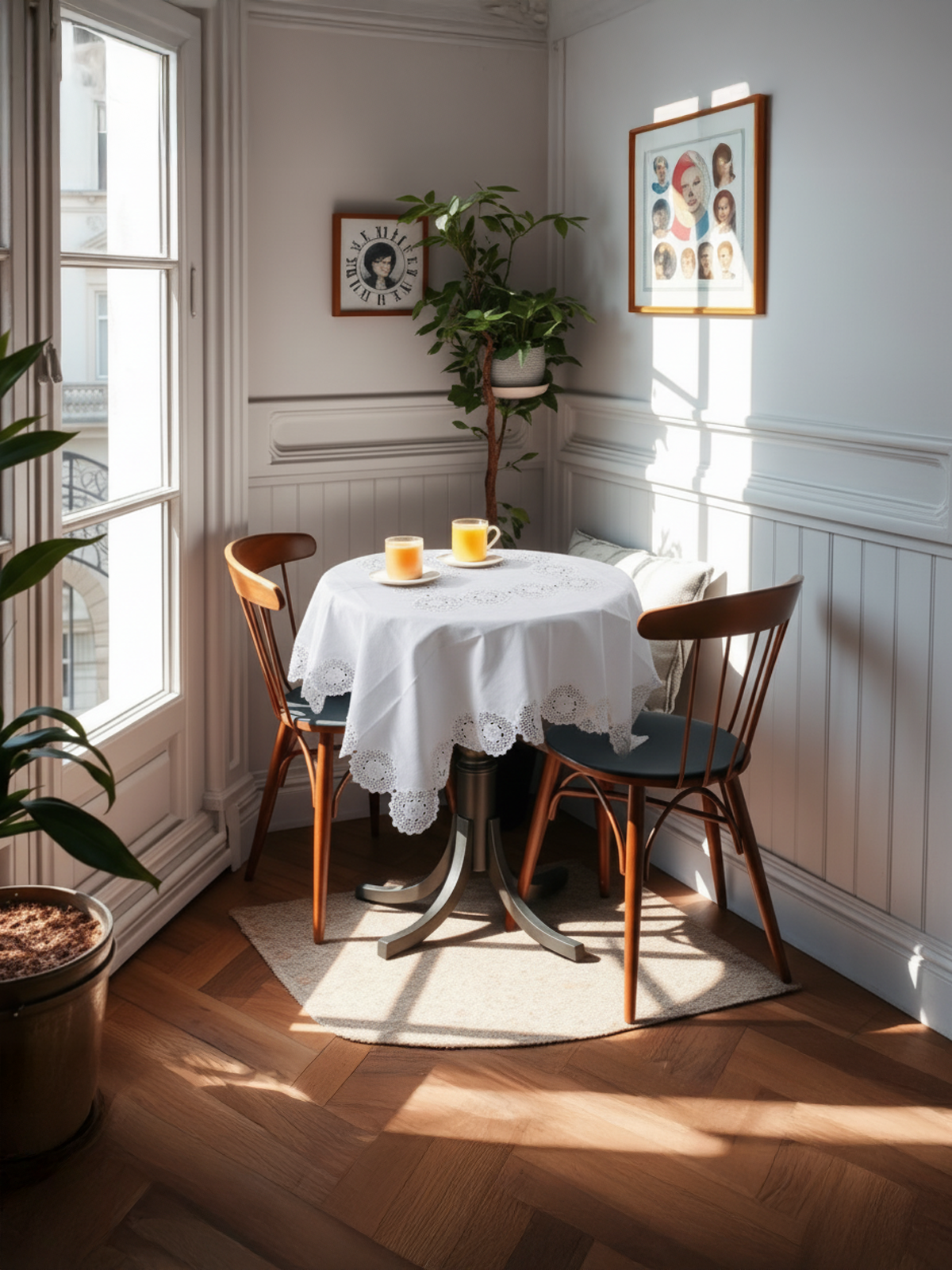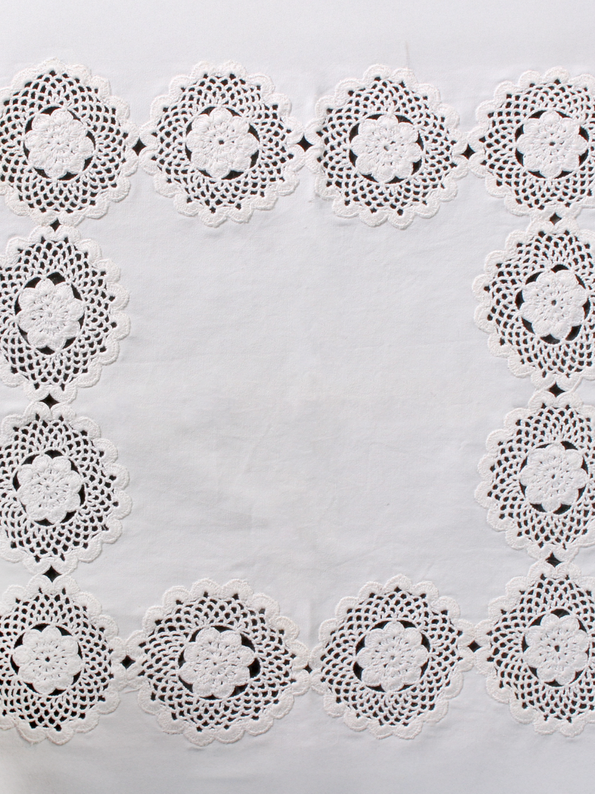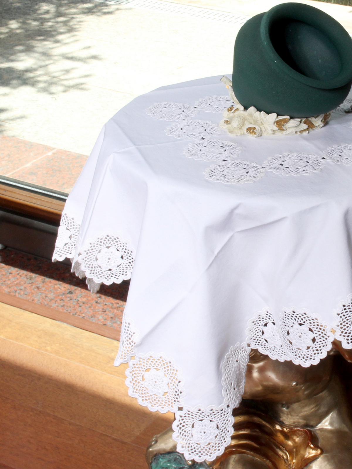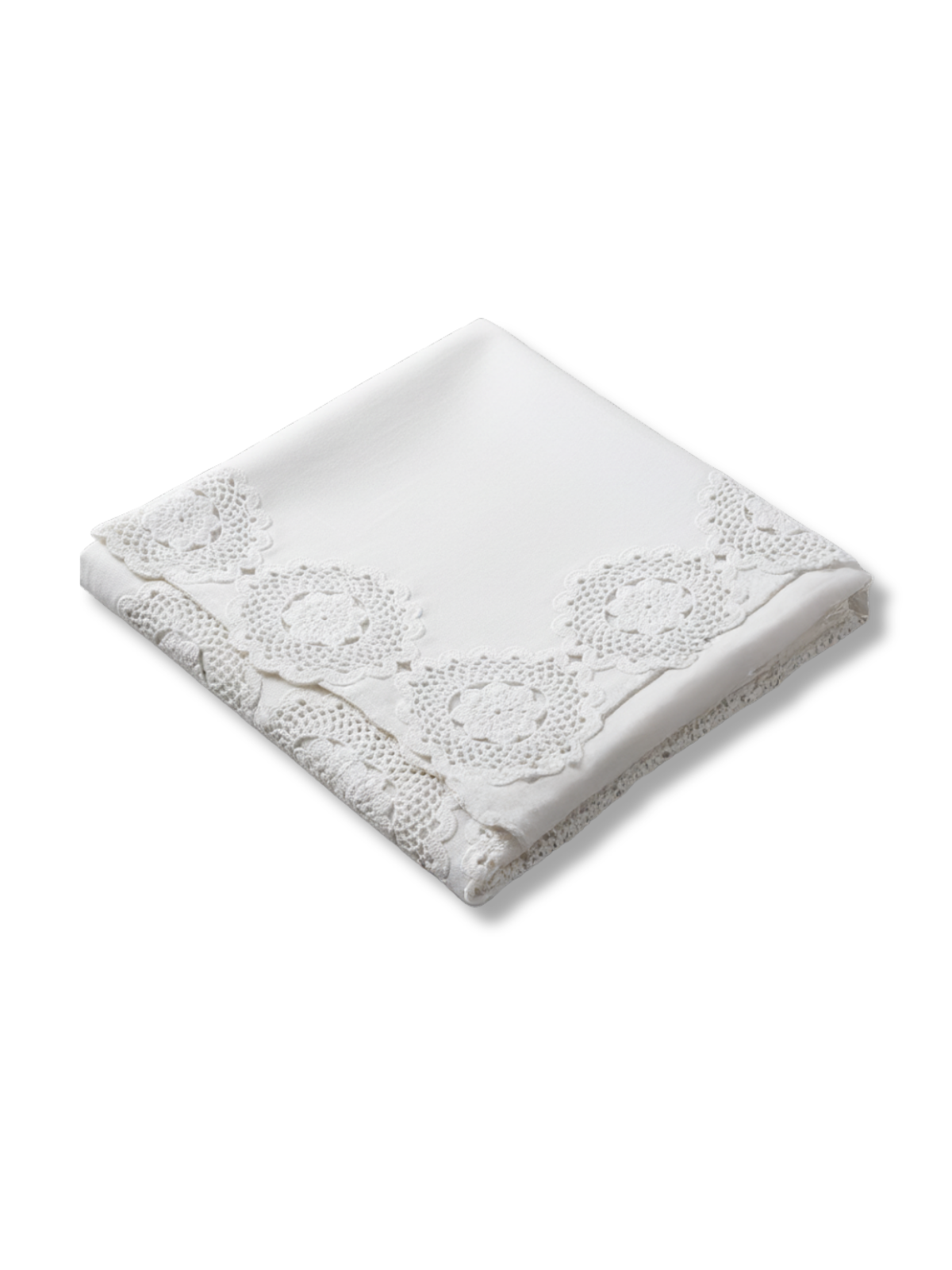 Kalın beyaz alpaga keten kumaşın merkezine, 12 adet antika tığ motif özenle aplike edilmiştir. Aynı koleksiyona ait 37 adet motif, örtünün kenarlarına makinada çevrilerek yerleştirilmiş; böylece çift taraflı kullanılabilen, hem zarif hem işlevsel bir örtü elde edilmiştir.