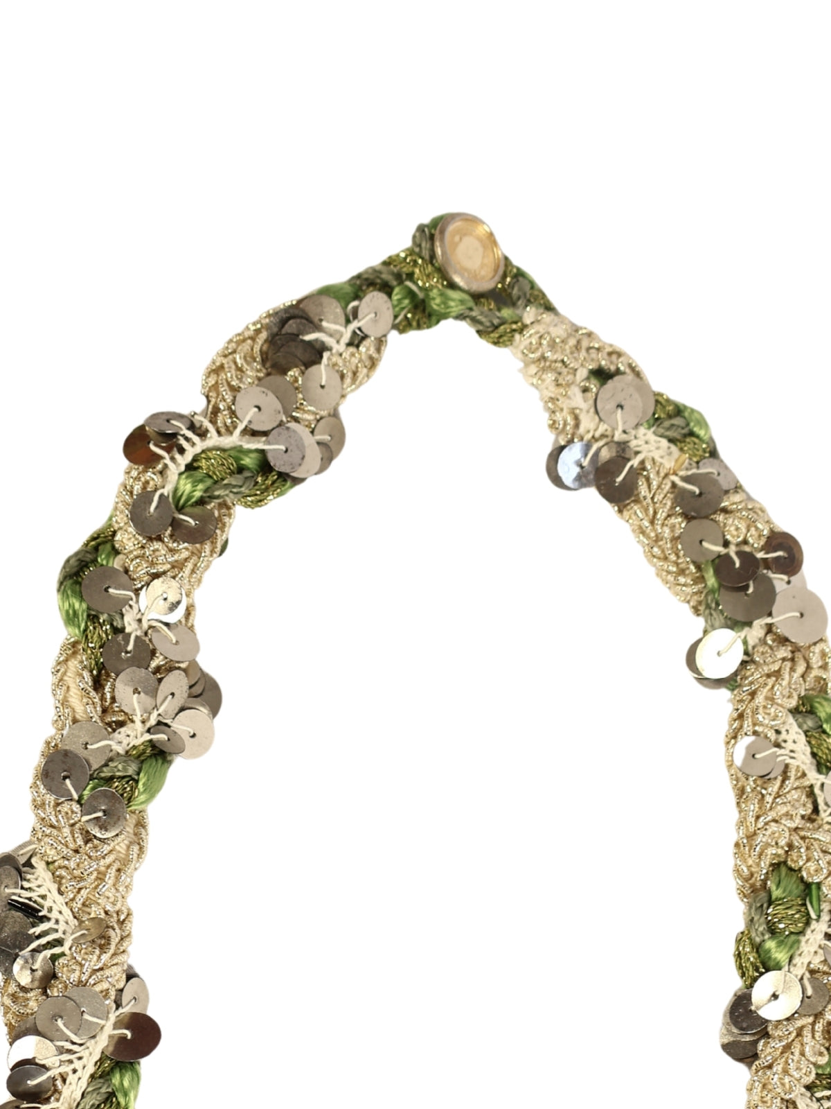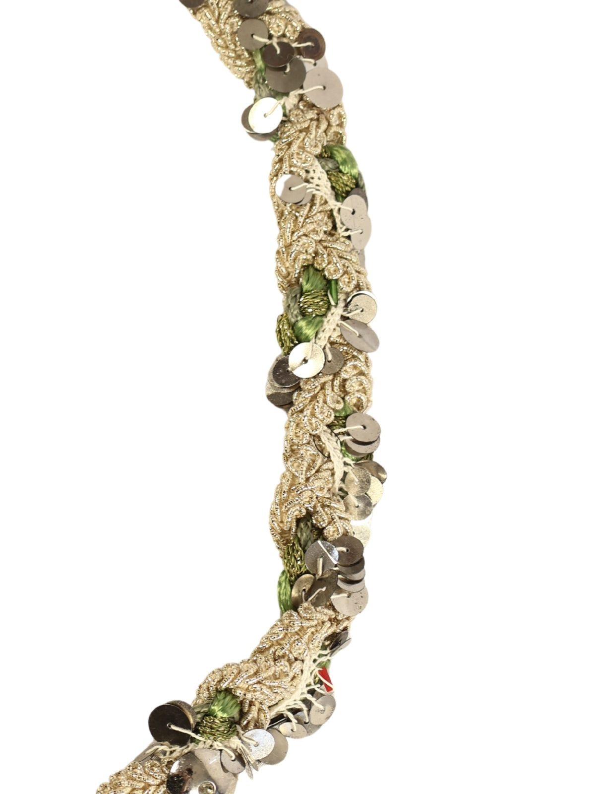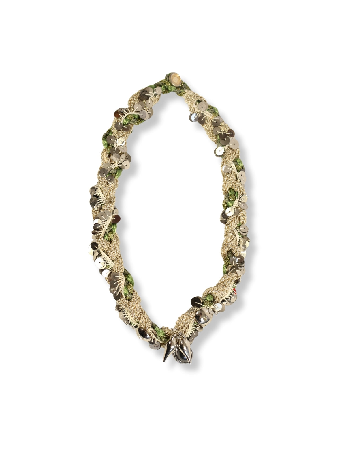 Gold kordonet ile renkli ipek filoş ipliklerin bir araya getirilmesiyle tasarlanan bu kolye, elde örülmüş gümüş rengi payetli harç ile zenginleştirilmiştir. Aynı tonlardaki gümüş detaylar, doğal taşlar ve kolye uçlarıyla tamamlanarak zarif ve gösterişli bir form kazanmıştır.