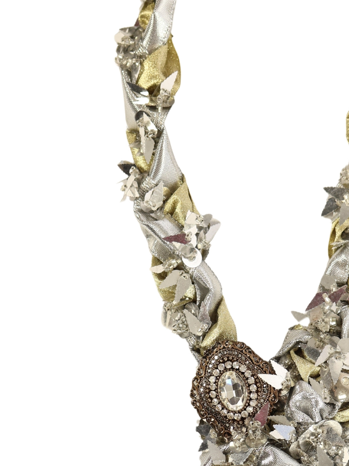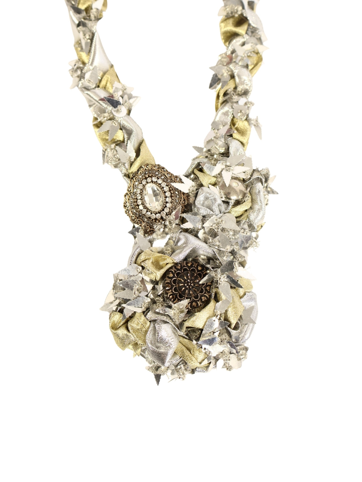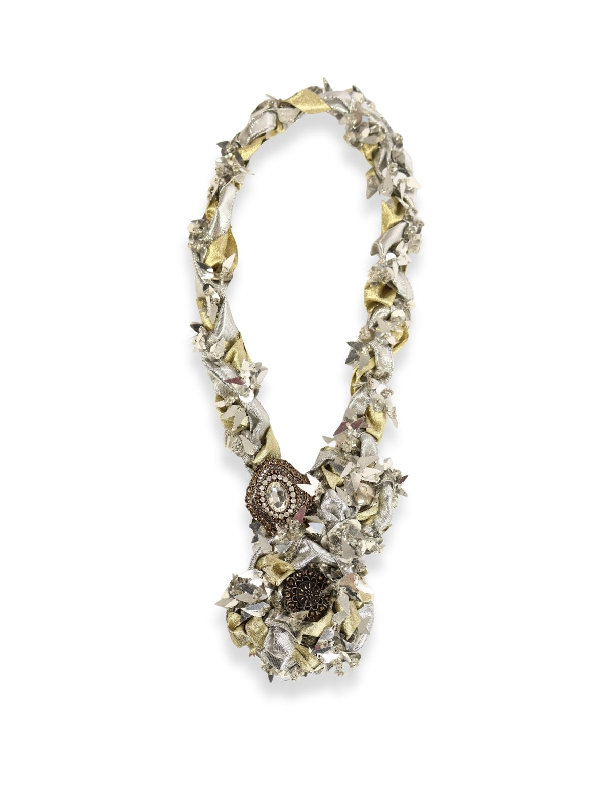 Gold ve gümüş renkli harçların sarkaçlı formlarda bir araya getirilmesiyle oluşturulan kordon, uç kısımlarına verilen özgün şekillerle dikkat çeker. Kolye, taş detayları ve broş benzeri süslemelerle tamamlanarak göz alıcı bir form kazanmıştır.