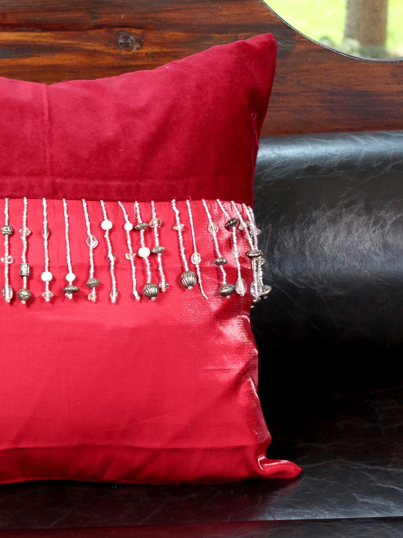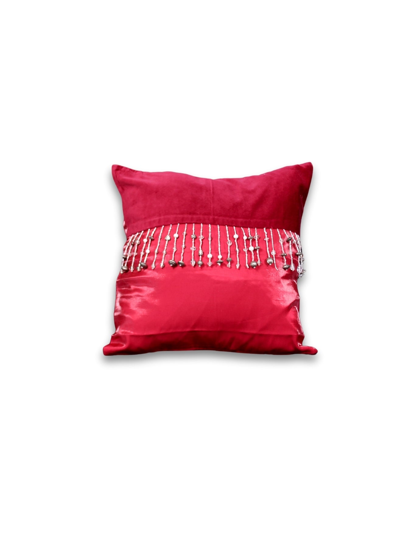 Butik tarzda, tamamen elde üretilen bu özel yastık kılıfı; bordo renk kadife ve organze saten kumaşların zarif birlikteliğinden oluşur. Arkası fermuarlı olarak çalışılan tasarımın, iki farklı kumaşın birleşim hattı; gümüş görünümlü topaz taşlar, inci görünümlü süslemeler ve kesme boncuklarla elde süslenmiştir. Tek tasarım ve kişiye özel bu eser, hem vintage ev dekorasyonuna katkı sunar hem de anlamlı bir hediye alternatifi olarak öne çıkar.