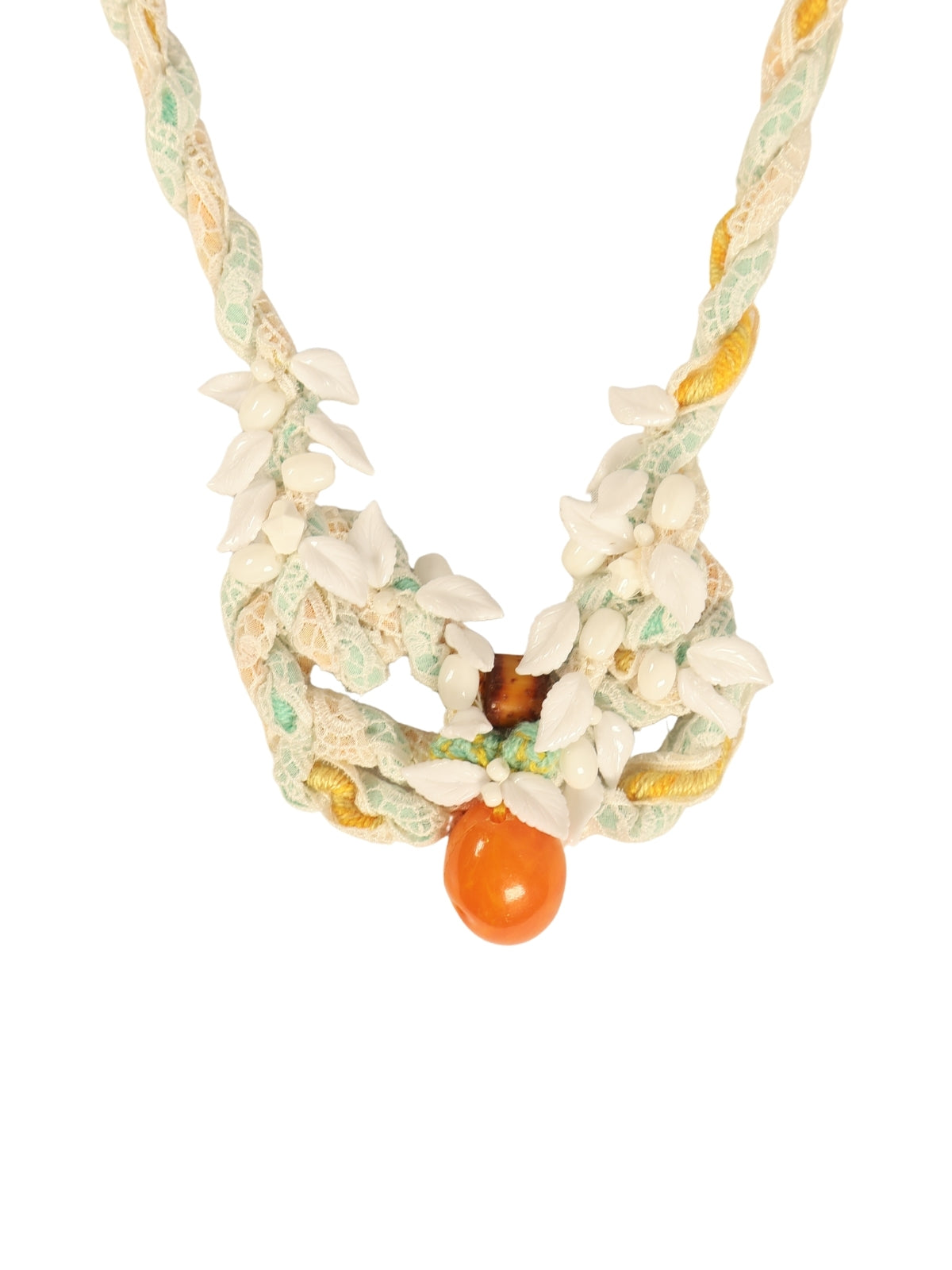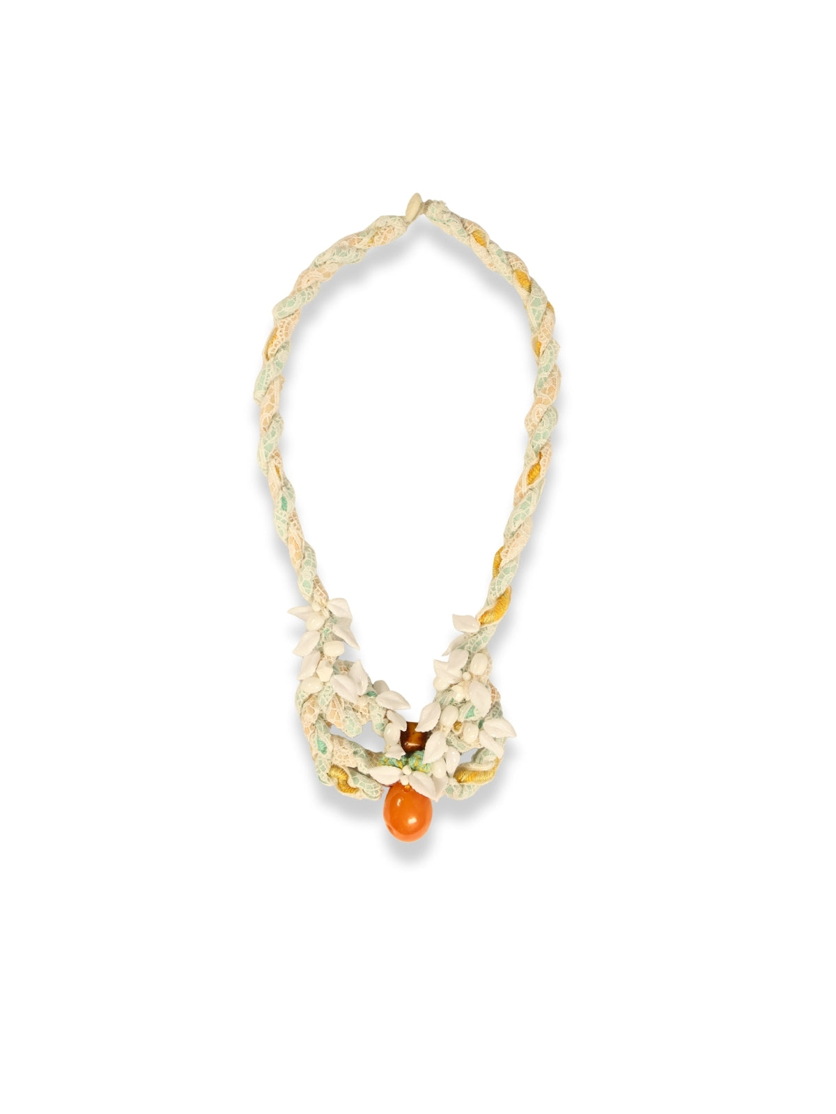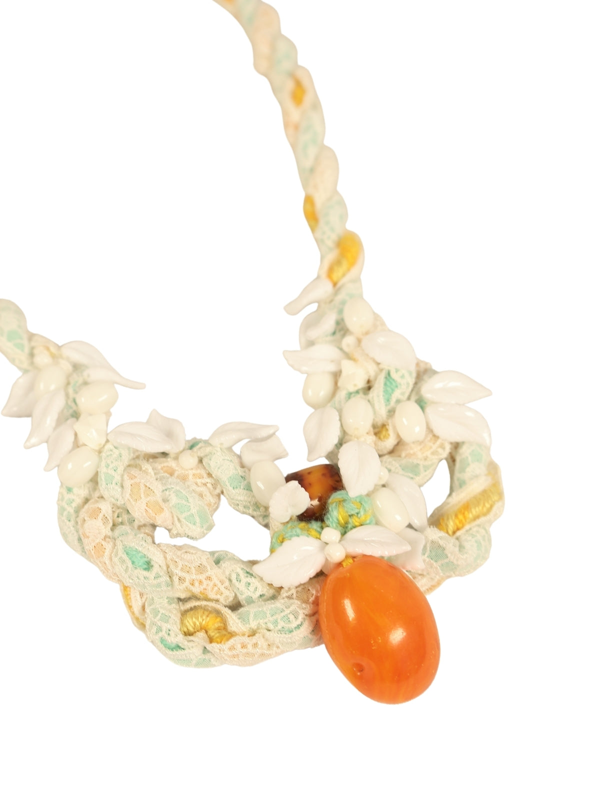 Ekru renkteki dantel, renklendirilerek düğümlerle şekillendirilmiş ve kolye formuna dönüştürülmüştür. Uç kısmı hakiki taşlar, boncuklar ve şekilli taşlarla zenginleştirilerek son dokunuş yapılmıştır.