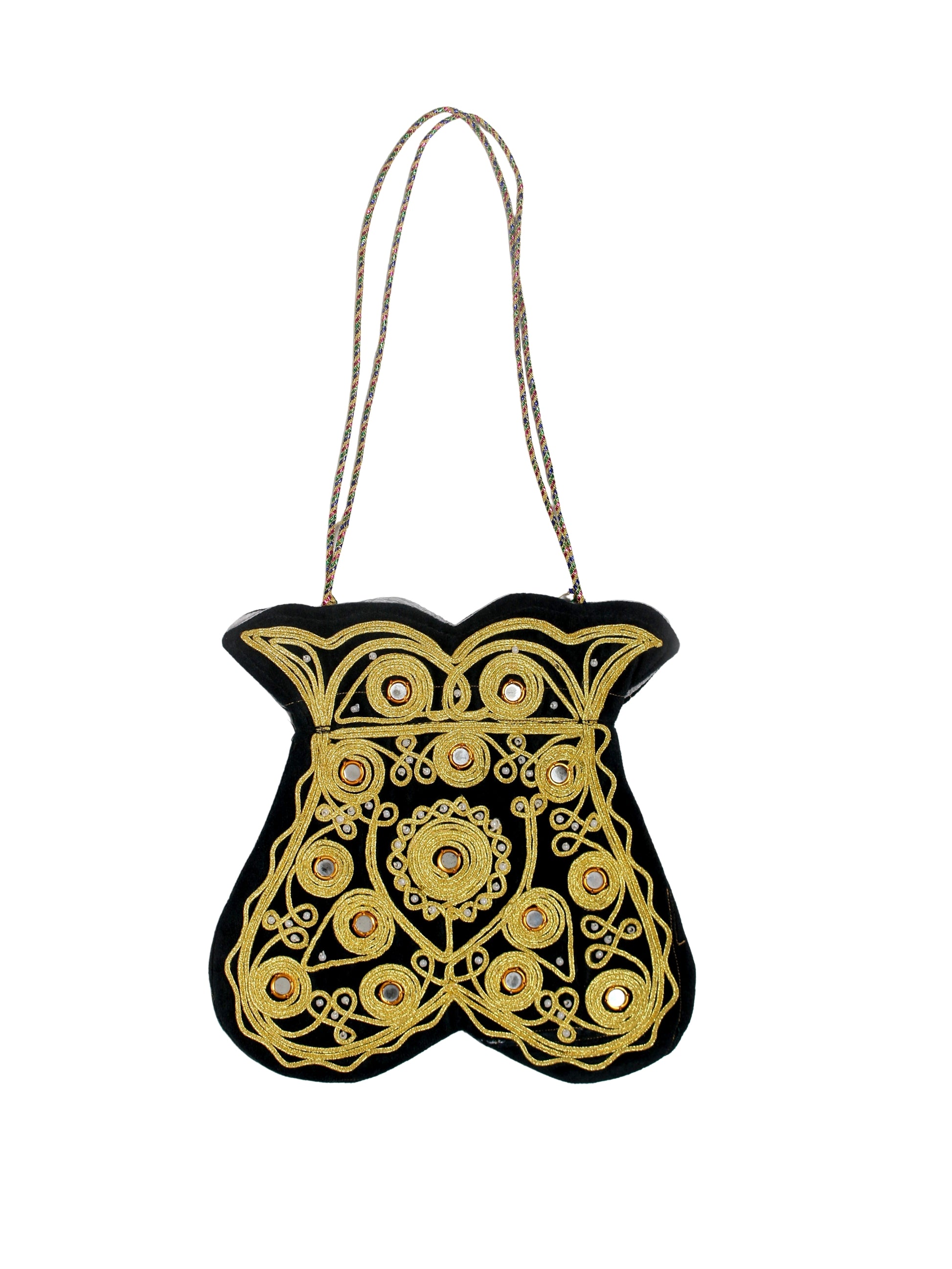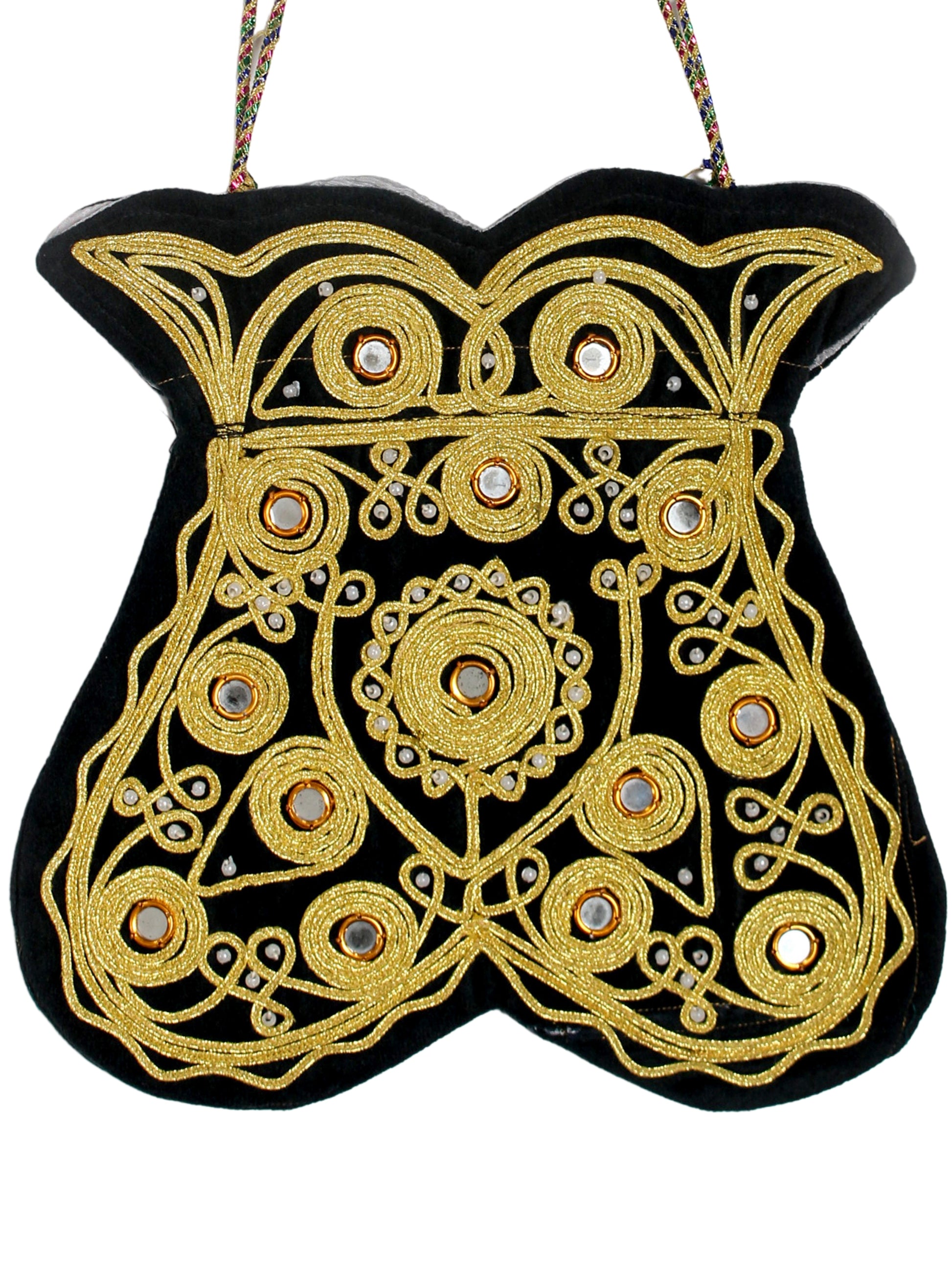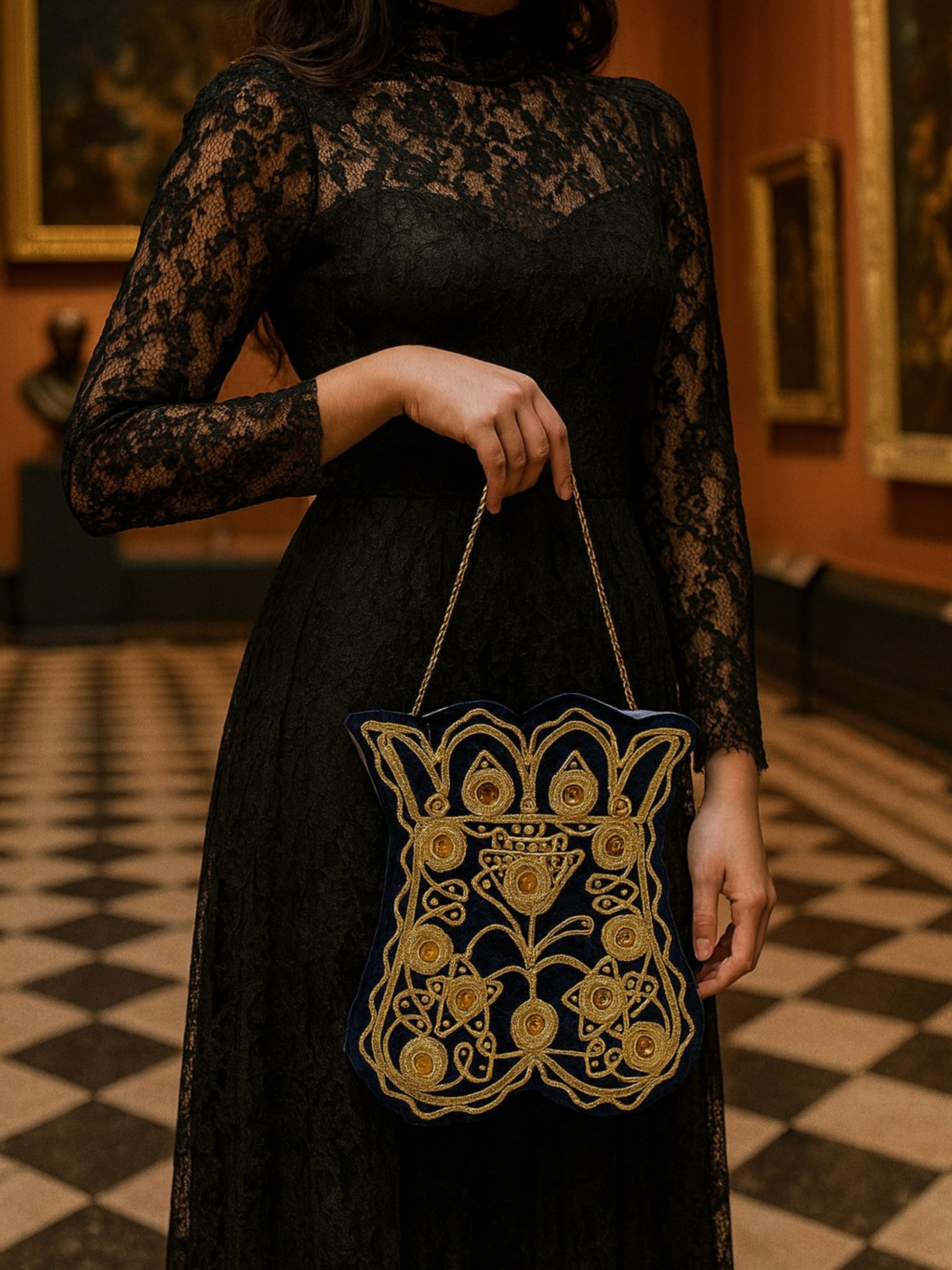Gece Göz – Siyah Kadife Üzeri Altın Aynalı El İşlemeli El Çantası