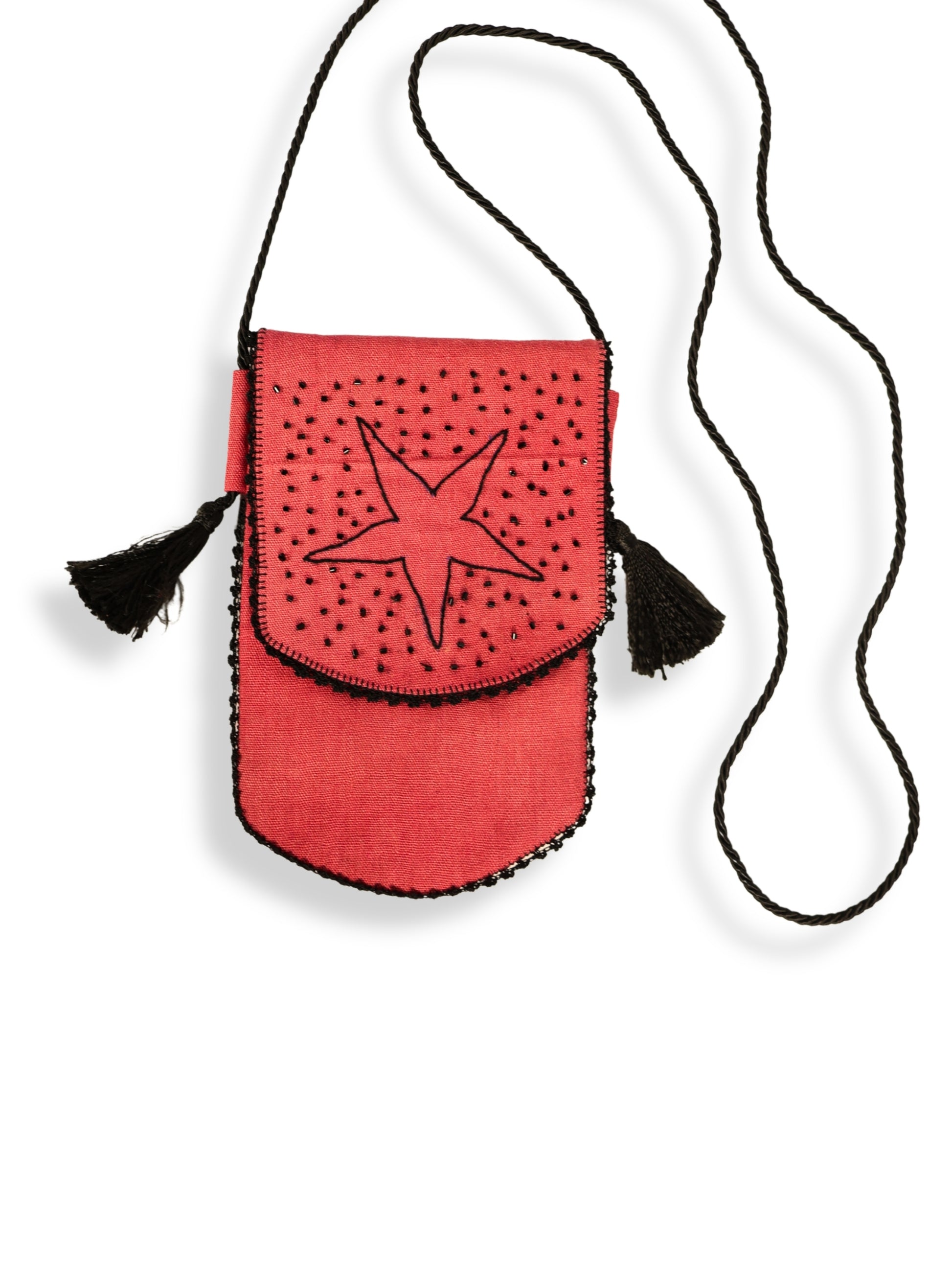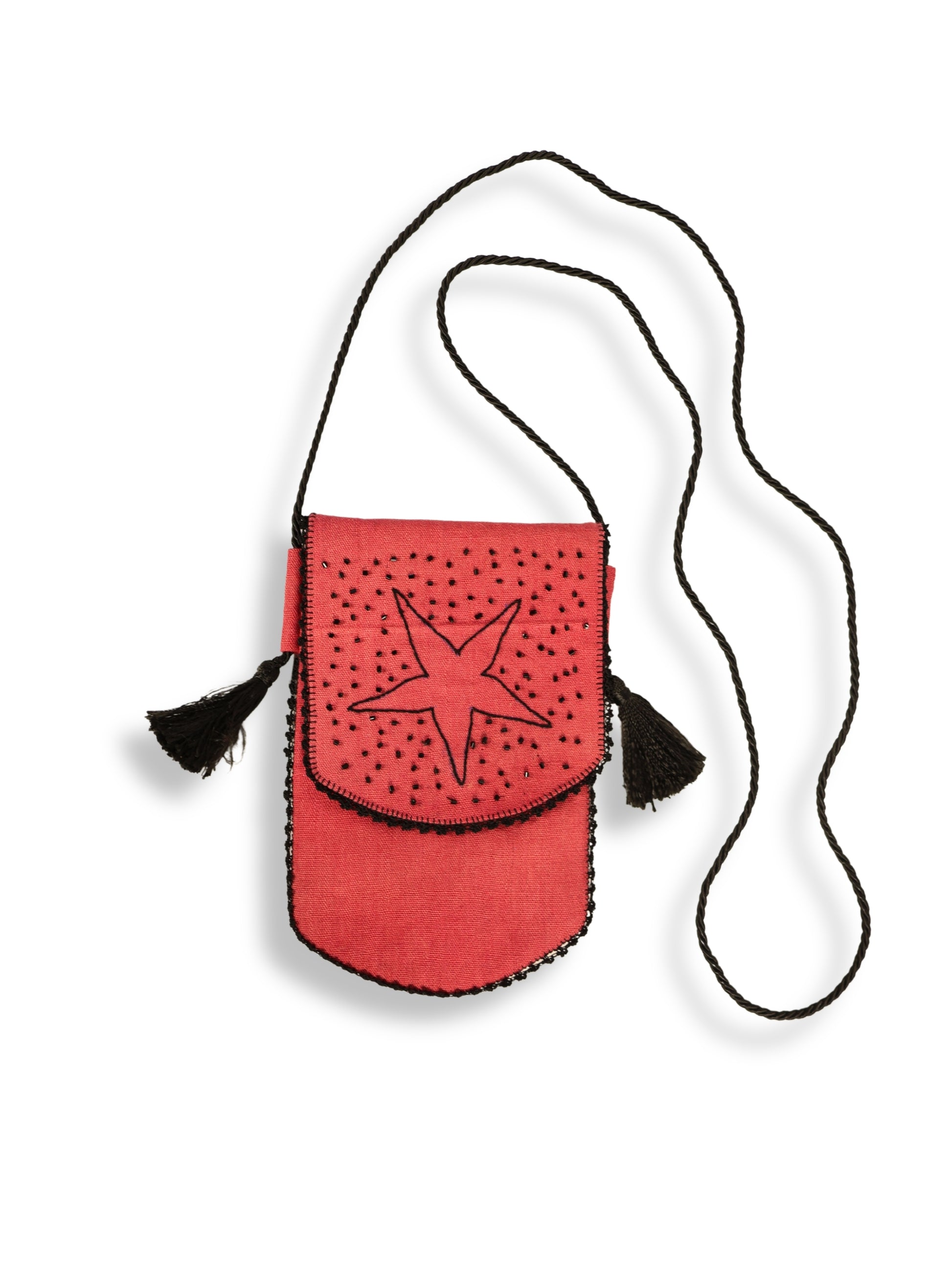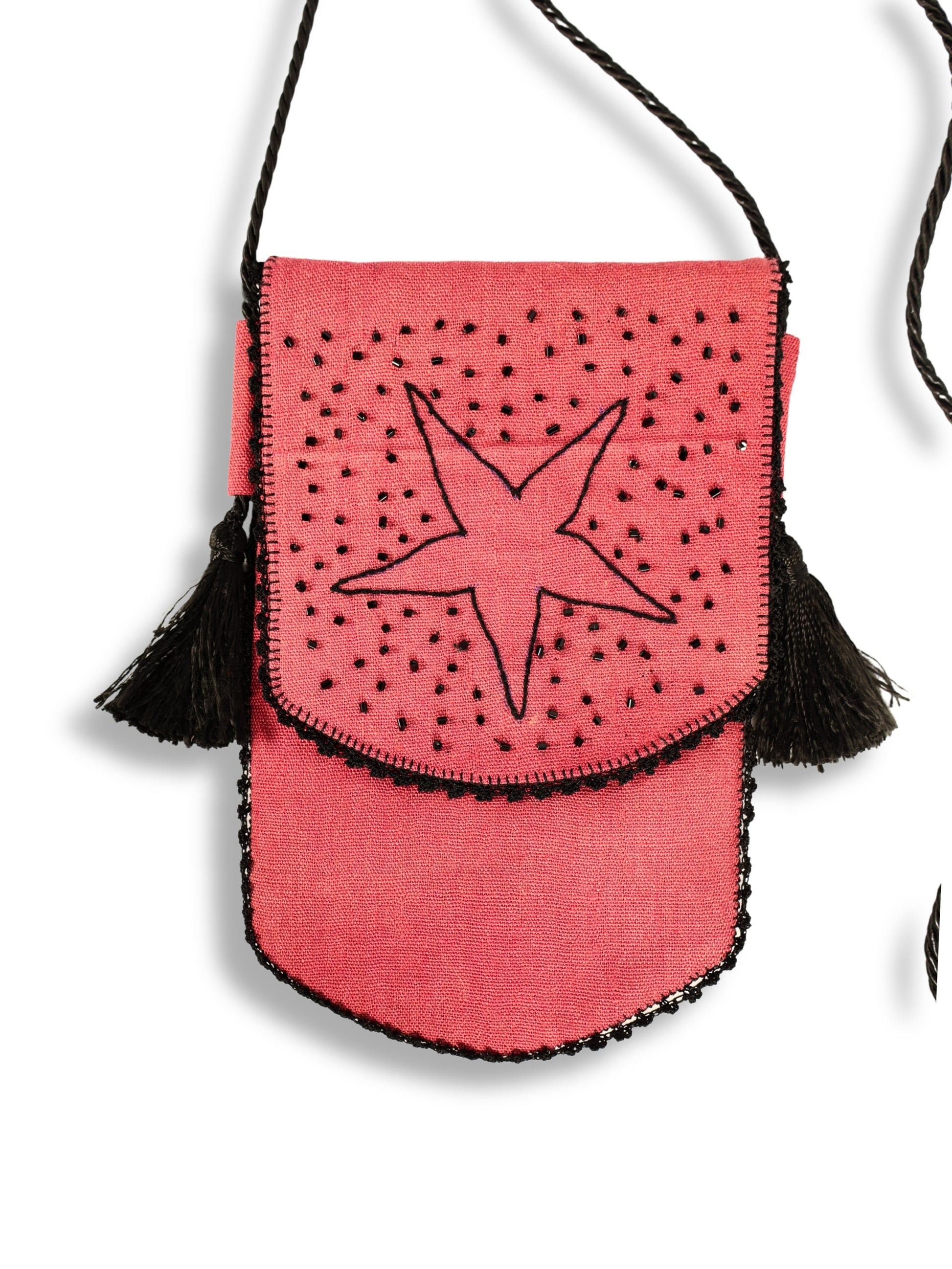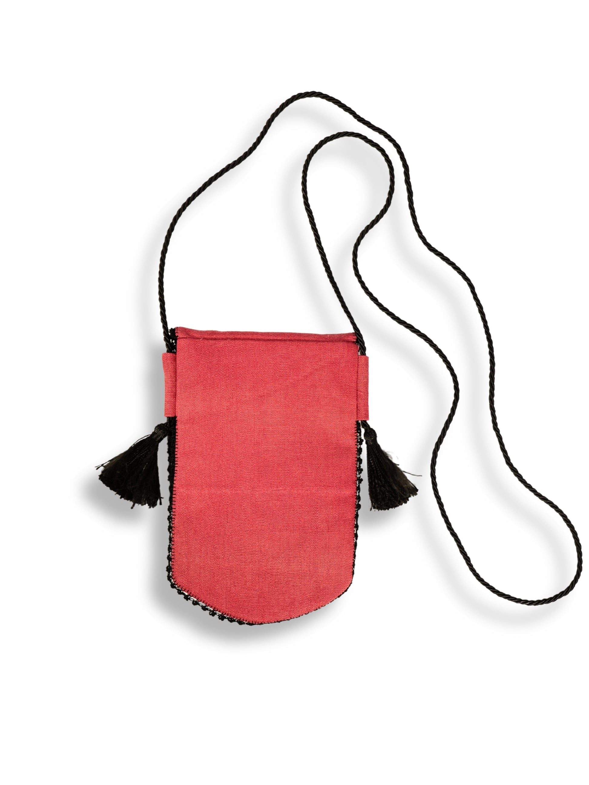 Gül kurusu tonlarında ketenden, alt kısmı zarif bir kavisle biten bu özel kese; el işçiliğiyle siyah iplikler kullanılarak işlenmiş ve boncuklarla süslenmiştir. Kapağı kendinden dönmeli formda tasarlanmış olup çıtçıtlıdır. Kesenin tüm çevresi siyah ipek iplikle tığla tığlanmış, kenar ve sap kısımları siyah kordonet ve püskül detaylarıyla tamamlanmıştır. İç kısmı astarlı olan bu tasarım, zarif görünümünün yanı sıra işlevselliğiyle de öne çıkar.