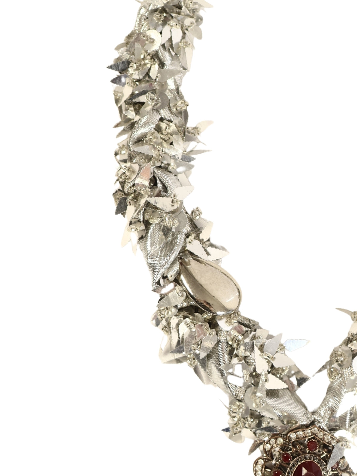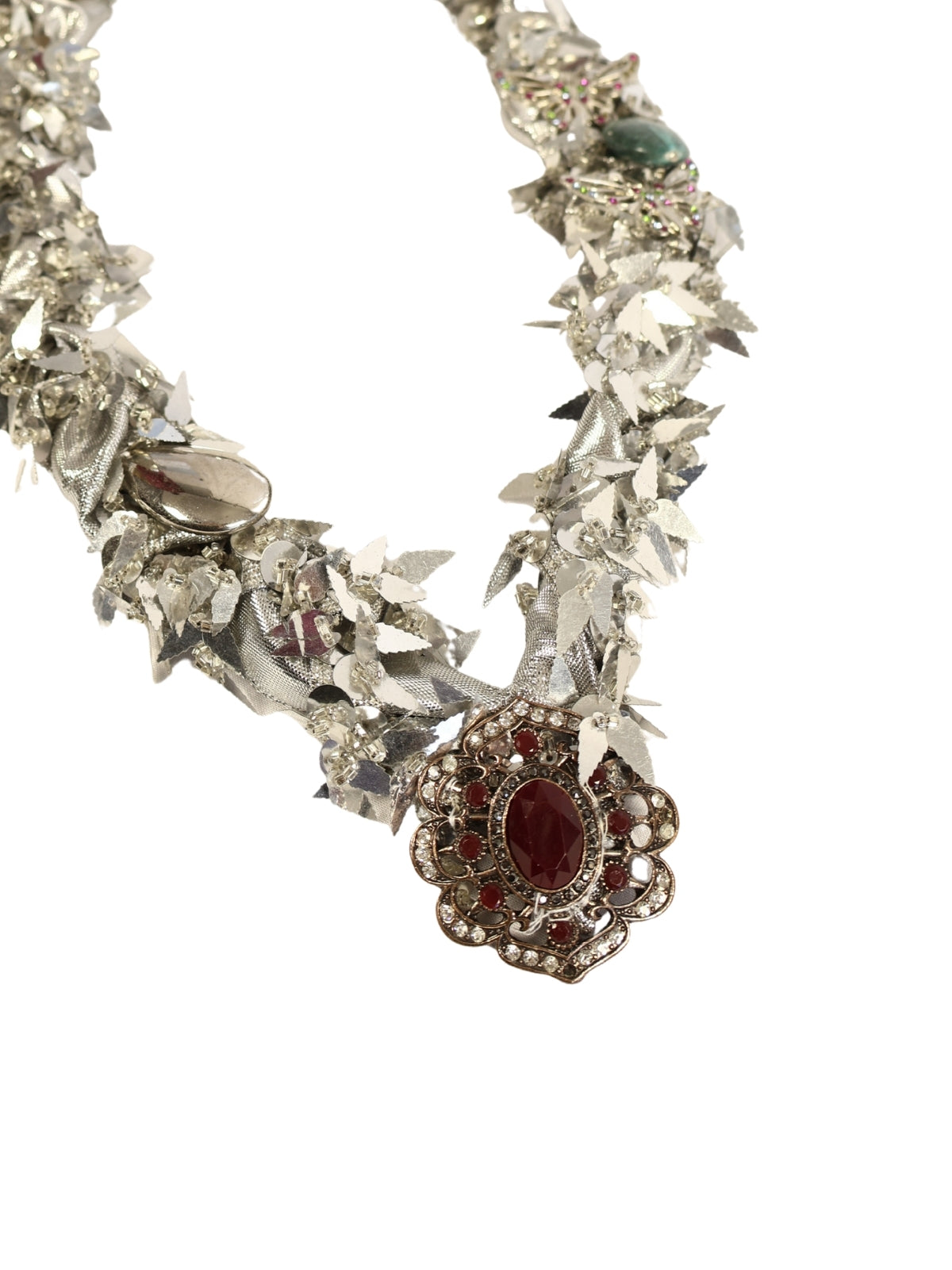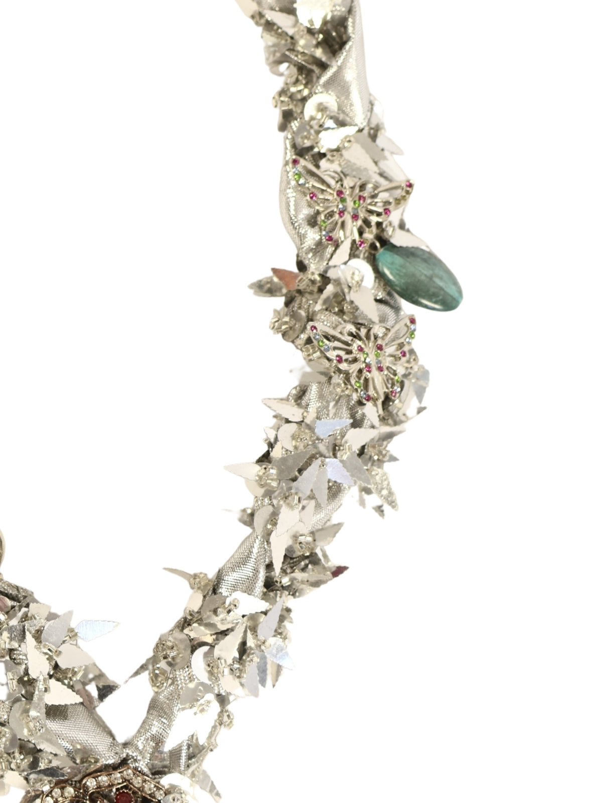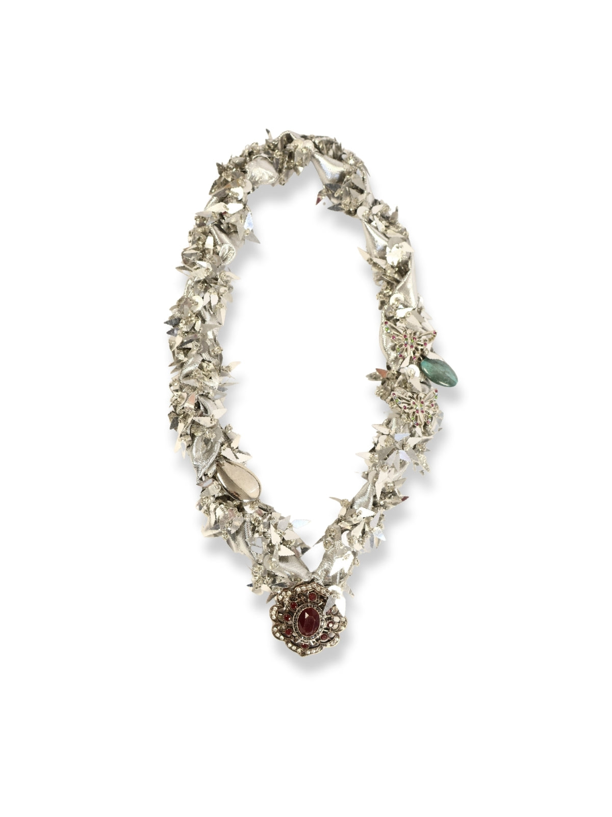 İpek kurdele ve gümüş payetli harçtan şekillendirilen bu zarif kolye, gümüş görünümlü detaylar ve doğal taş süslemeleriyle harmanlanmıştır. Uç kısmında yer alan renkli broş, tasarımı güçlü bir finalle tamamlar.