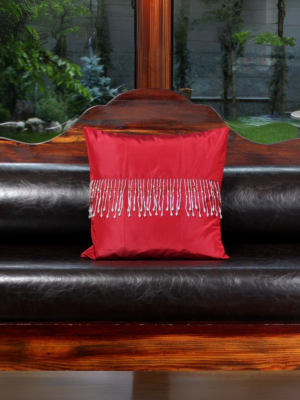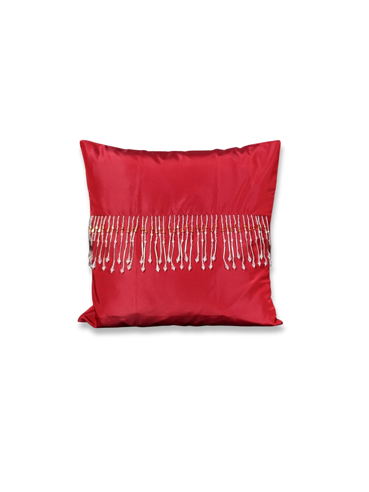Yoğun kırmızı tonlu ipek tafta kumaştan hazırlanan bu el yapımı yastık kılıfıdır. Arka yüzeyi fermuarlı; ön yüzeyi ise gümüş görünümlü topaz taşlar, inci dokulu detaylar ve kesme boncuklarla elde süslenmiştir. Kırmızının asaletini taşıyan gösterişli ve özel bir ev aksesuarıdır.