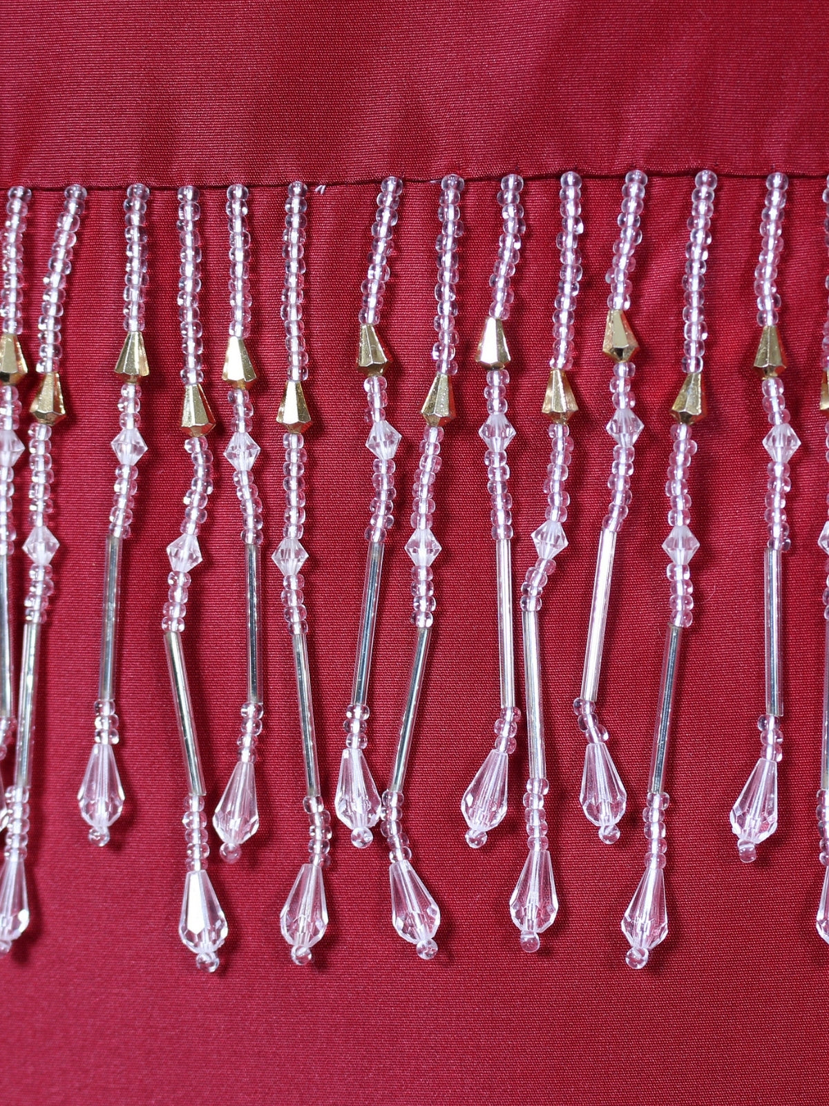 Kırmızı ipek tafta, topaz taş, inci görünümlü taş, kesme boncuk, fermuar