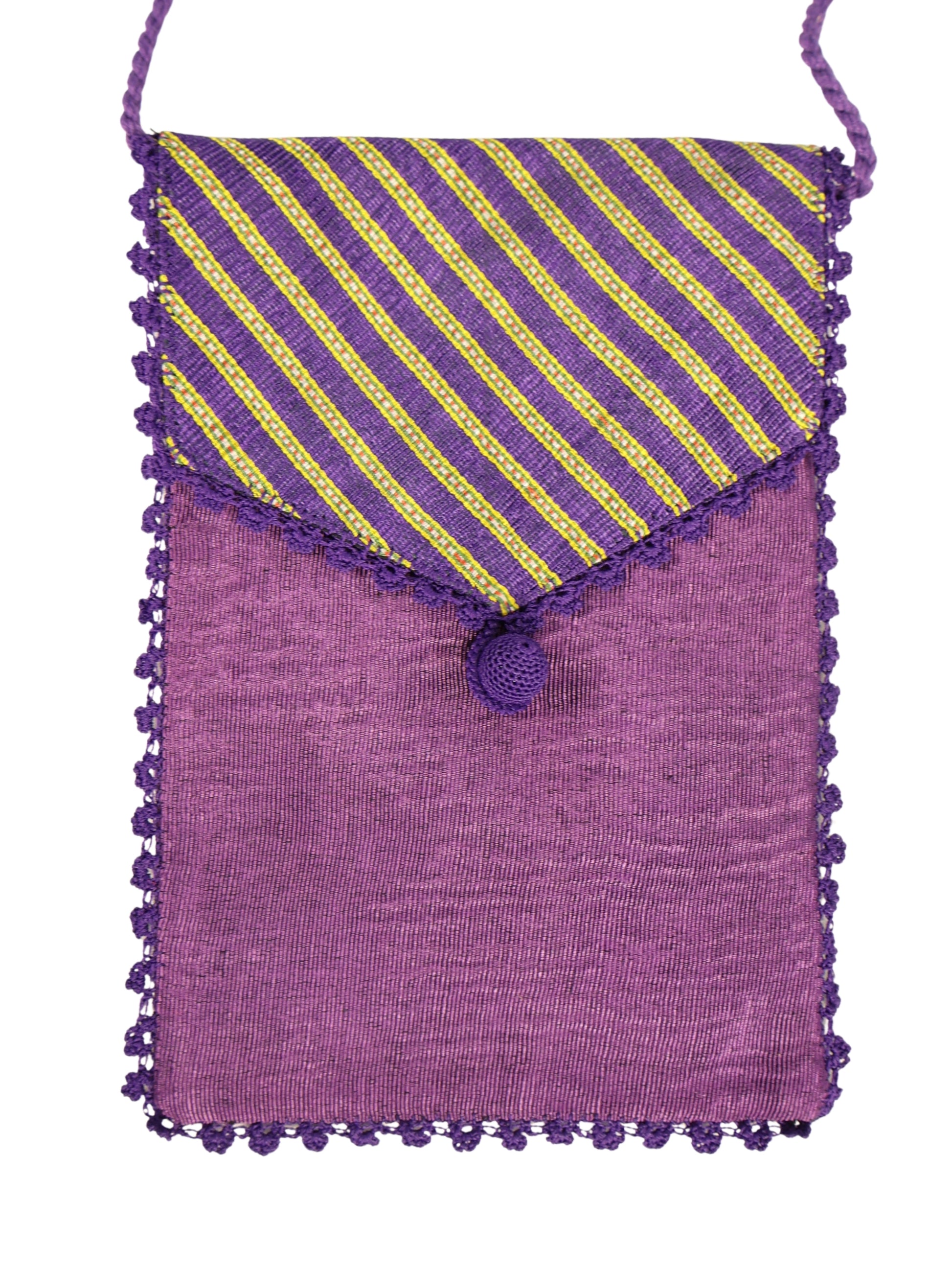 Lila ve hardal tonlarının zarif birlikteliğiyle tasarlanan bu özel kese, ipek fay kumaştan dikdörtgen formda hazırlanmıştır. Kapağı, lila–hardal çizgili kumaştan kendinden dönme formda çalışılmış ve uç kısmı üçgen biçiminde şekillendirilmiştir. Kapak ucunda, el örmesi ipek iplikle kaplanmış “top düğme boncuğu” detay yer alır. Kesenin tüm kenarları, aynı tonlardaki ipek iplikle tığla işlenmiş, aynalarından ise elde bükülmüş ipek kordonla sap oluşturulmuştur. İç kısmı ipek astarlık kumaşla kaplanmış olup, her detayı özenle işlenmiş özgün bir el işçiliği ürünüdür.