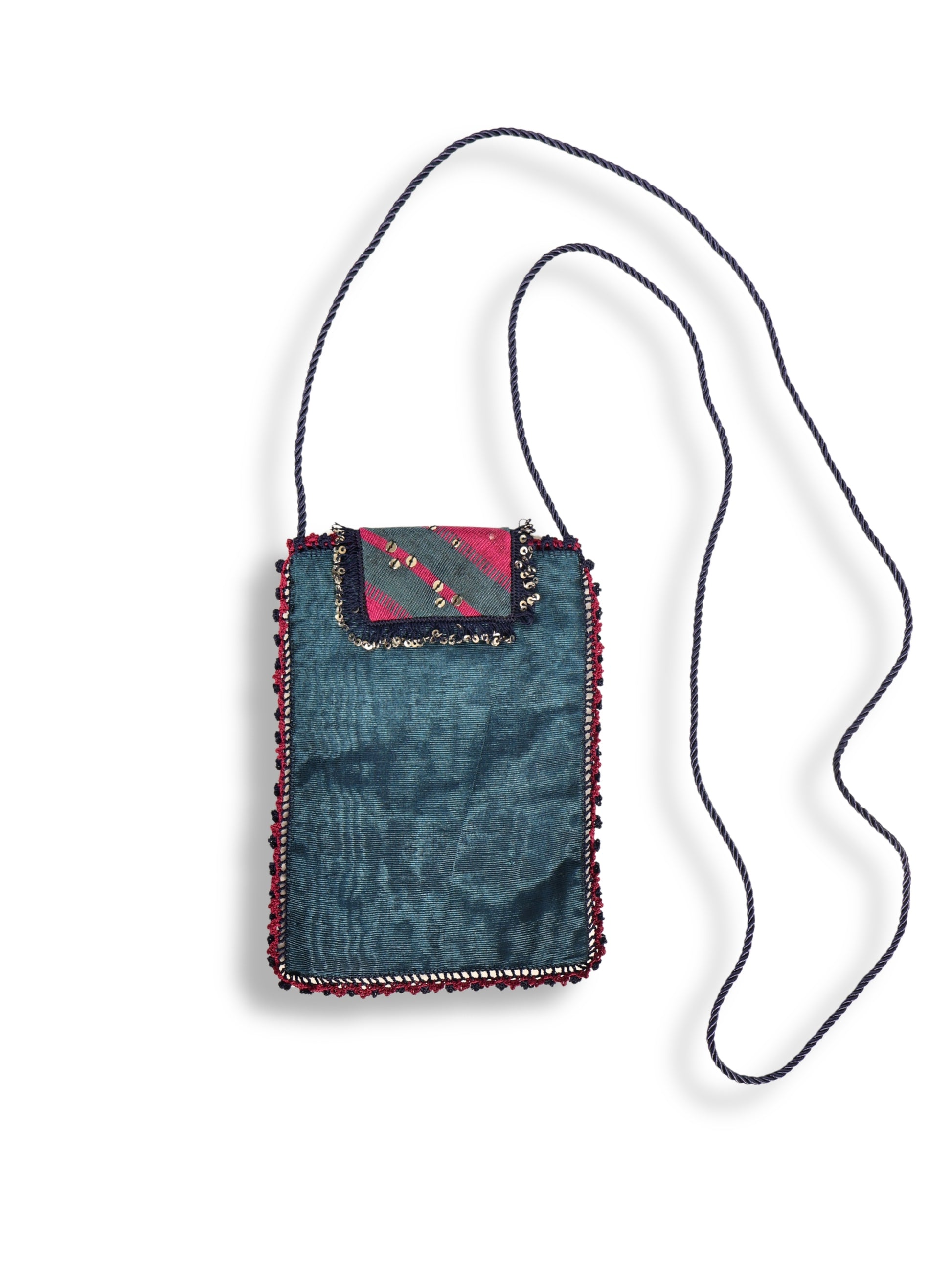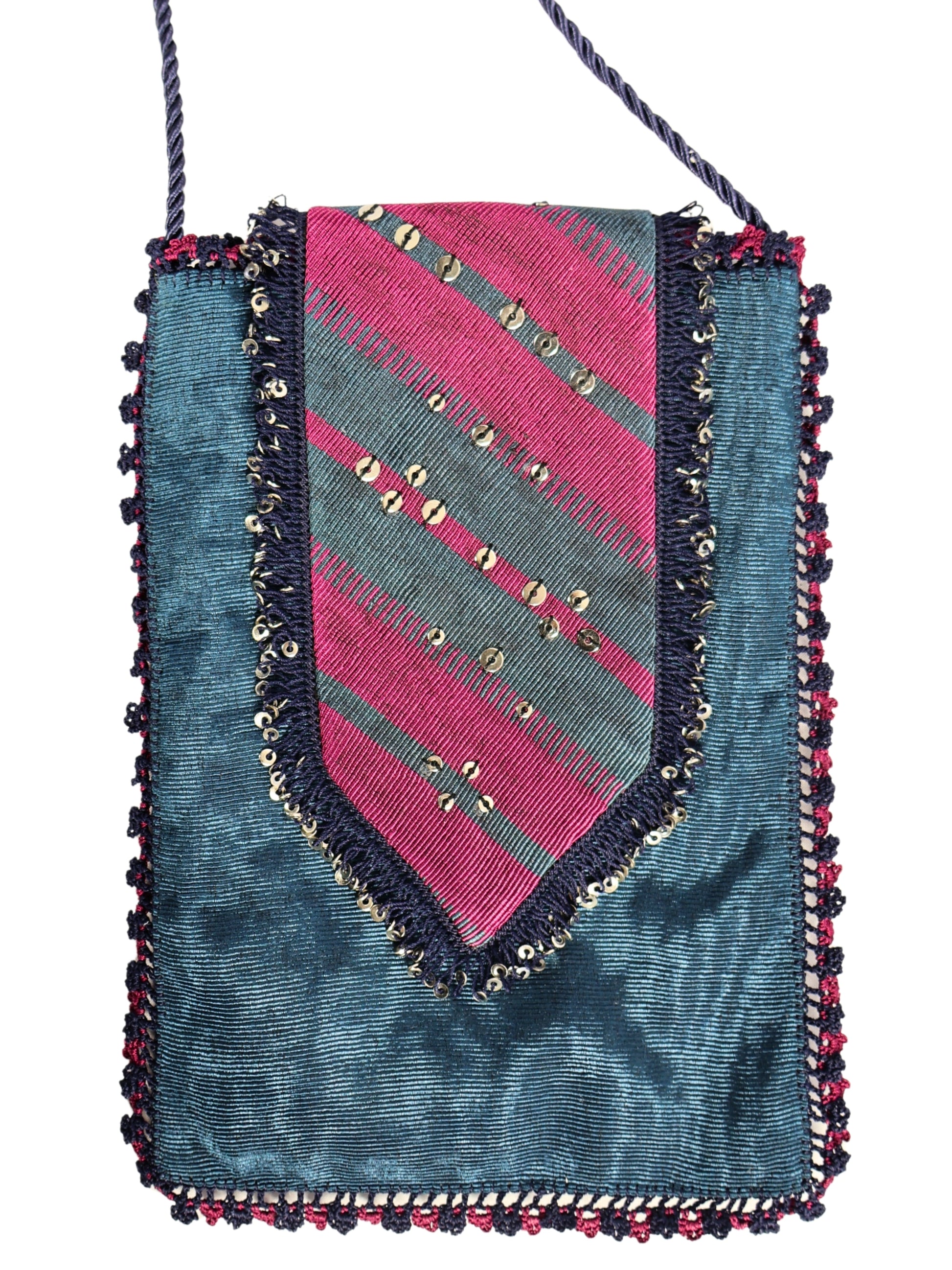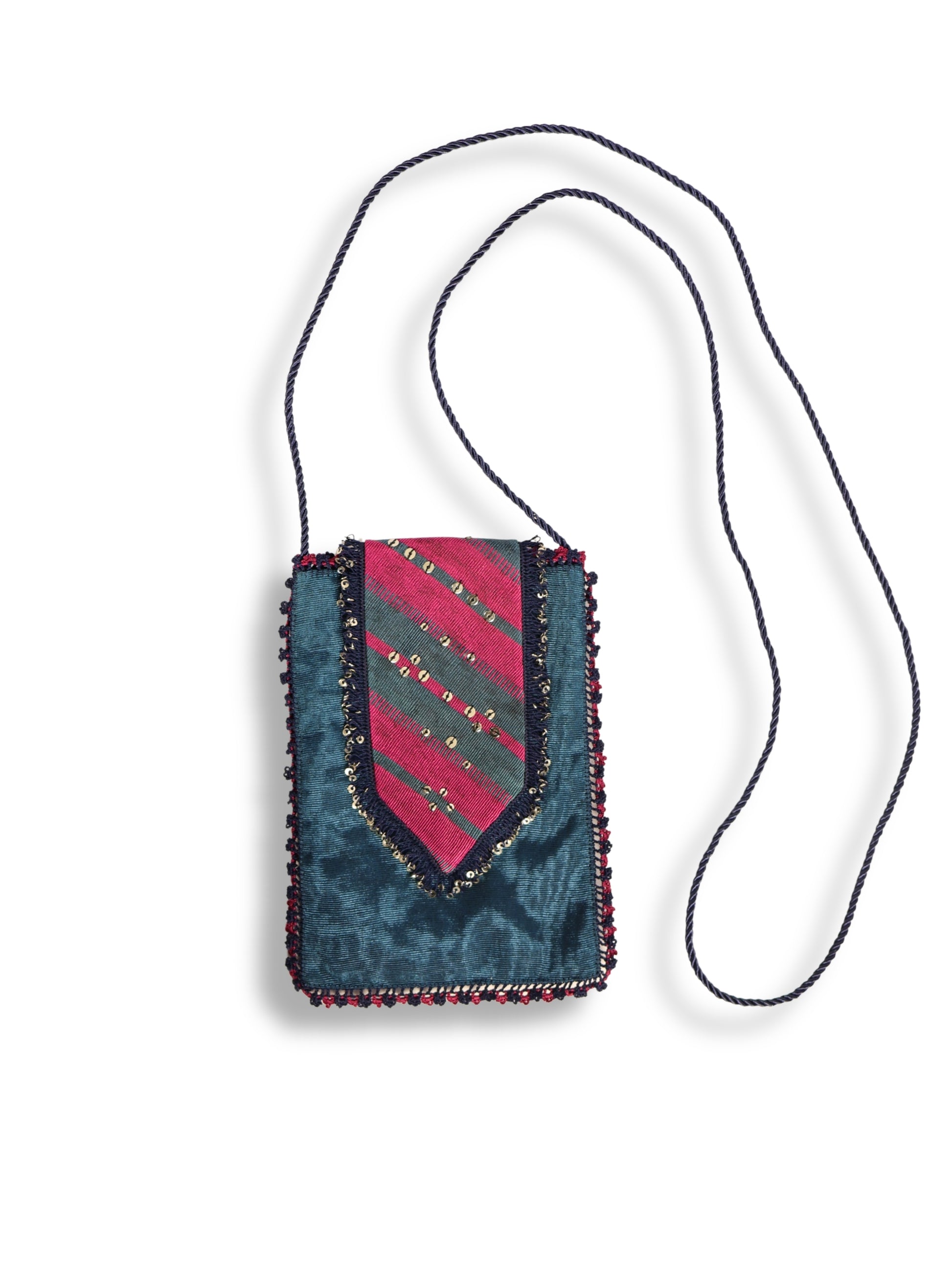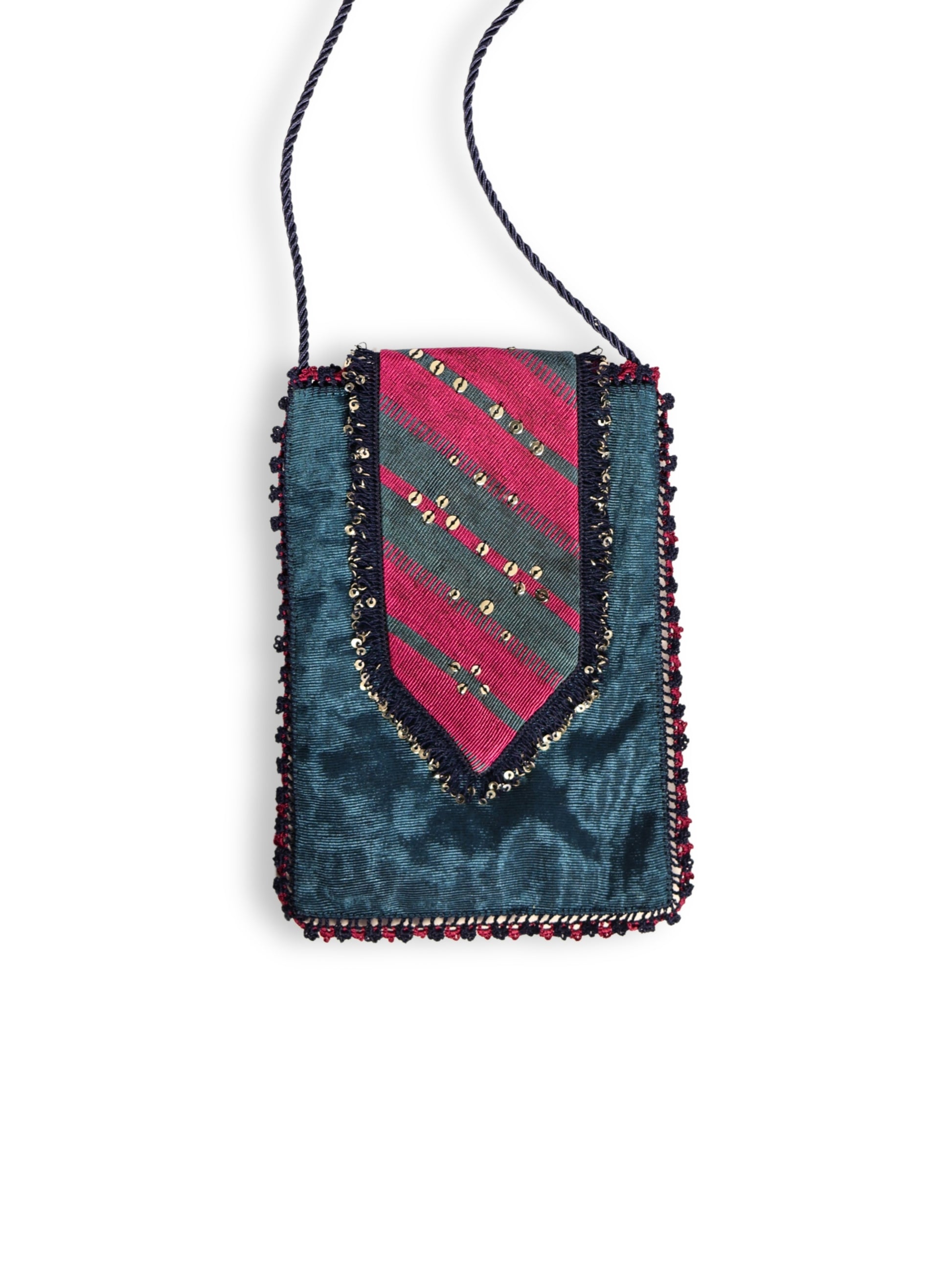 Petrol tonlarında fay kumaştan, dikdörtgen formda ve dönme kapaklı olarak tasarlanan bu el yapımı kese; kumaşın kendi desenli versiyonuyla bütünleşik bir zarafet taşır. İç kısmı siyah ipek kumaşla astarlanmış, kapağı ise gümüş tonlu çelik payetlerle süslenmiştir. Kesenin tüm kenarları, içindeki tonlarla harmanlanarak ipek iplikle tığlanmıştır. Lacivert kordon detayıyla tamamlanan tasarım, zengin dokusu ve el işçiliğiyle dikkat çeker.