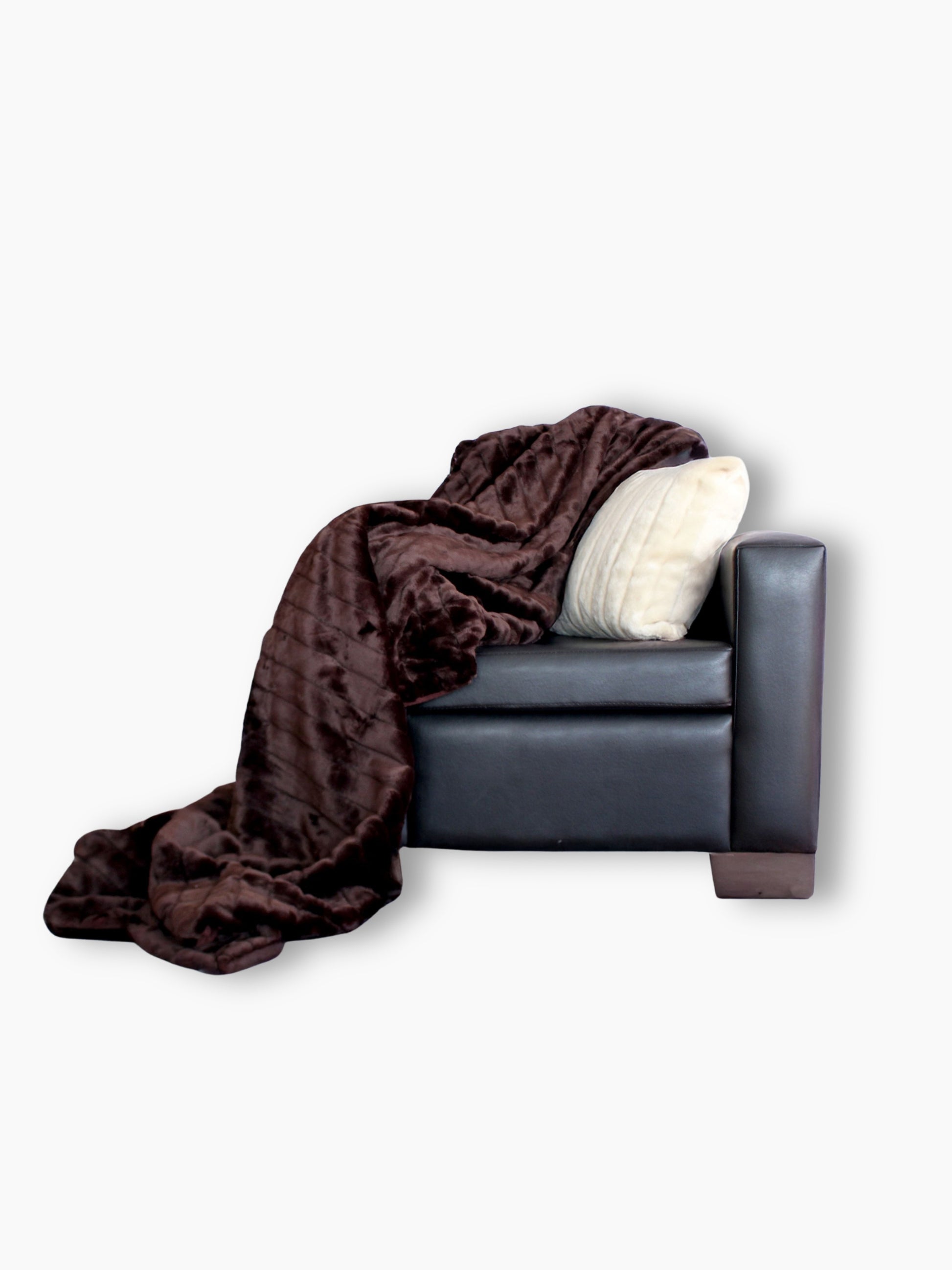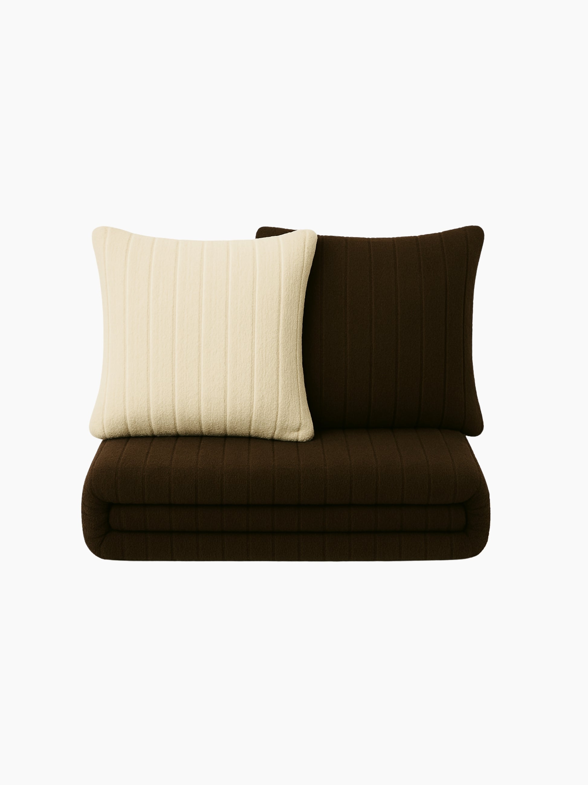 Yüksek kalite dokusu sayesinde hem battaniye hem de yatak örtüsü olarak kullanılabilir. Set içerisinde iki adet içi dolu bej kırlent yer almaktadır. Kahverengi tonunun derinliği ve bej kırlentlerin uyumu, kış günlerine sıcaklık ve zarif bir bütünlük katar.