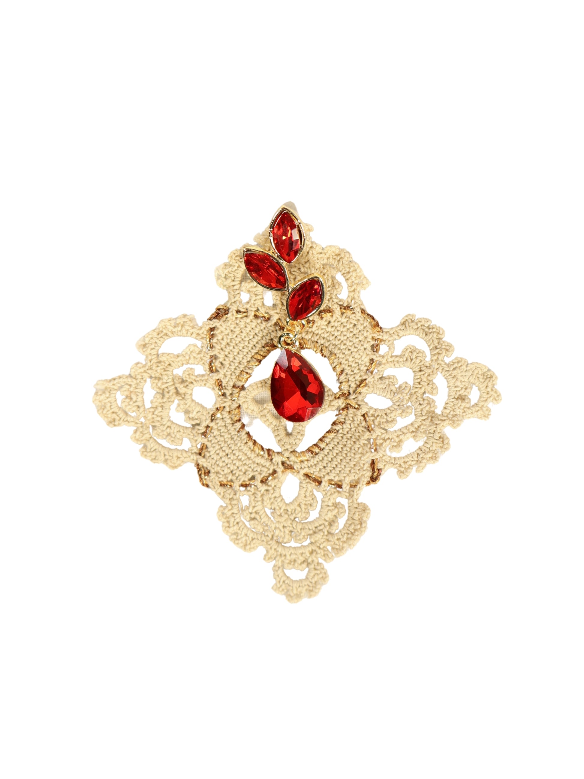Ekru renkli Ören Bayan tığ ipiyle elde örülmüş kare motif, merkez kısmı kahverengi tonlarla renklendirilerek sıcak bir kontrast kazandırılmıştır. Motifin orta noktası, yakut kaşlı görünüme sahip gold metal küpe aparatıyla zenginleştirilmiş; el işinin zarafetiyle modern takı estetiği bir araya getirilmiştir.
