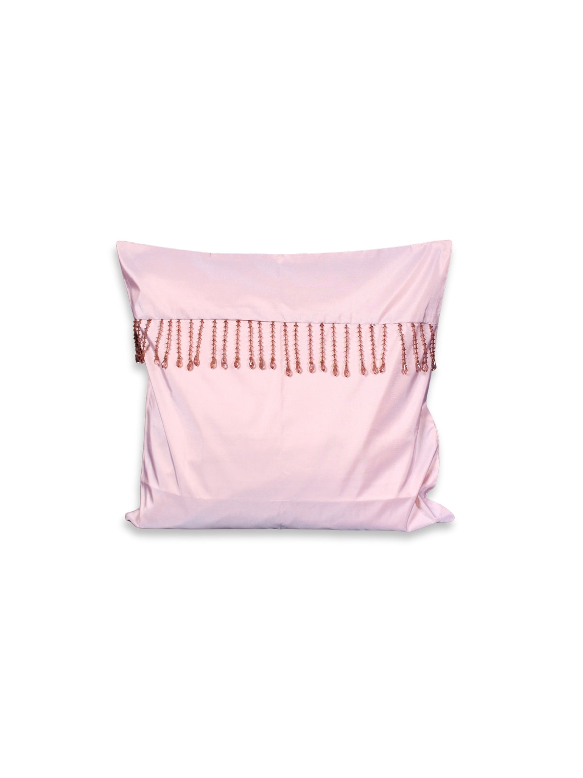 Pudra pembesi ipek tafta kumaştan üretilen bu dekoratif yastık kılıfı tamamen elde hazırlanmıştır. Arka kısmı fermuarlı olarak çalışılmış; ön yüzü ise topaz taşlar, inci görünümlü detaylar ve kesme boncuklarla süslenmiştir. Yumuşak renk geçişiyle romantik ve nazik bir atmosfer yaratır.