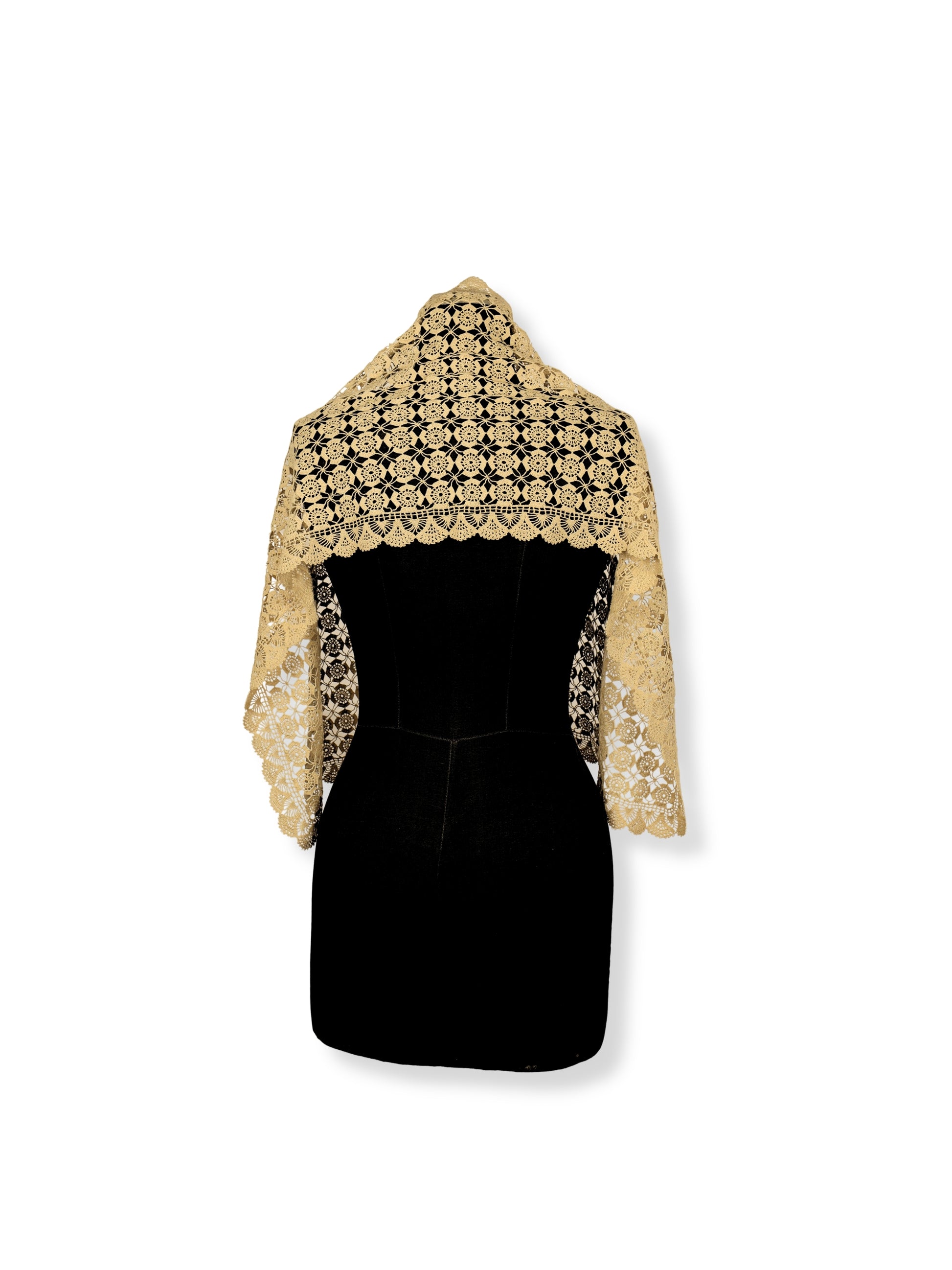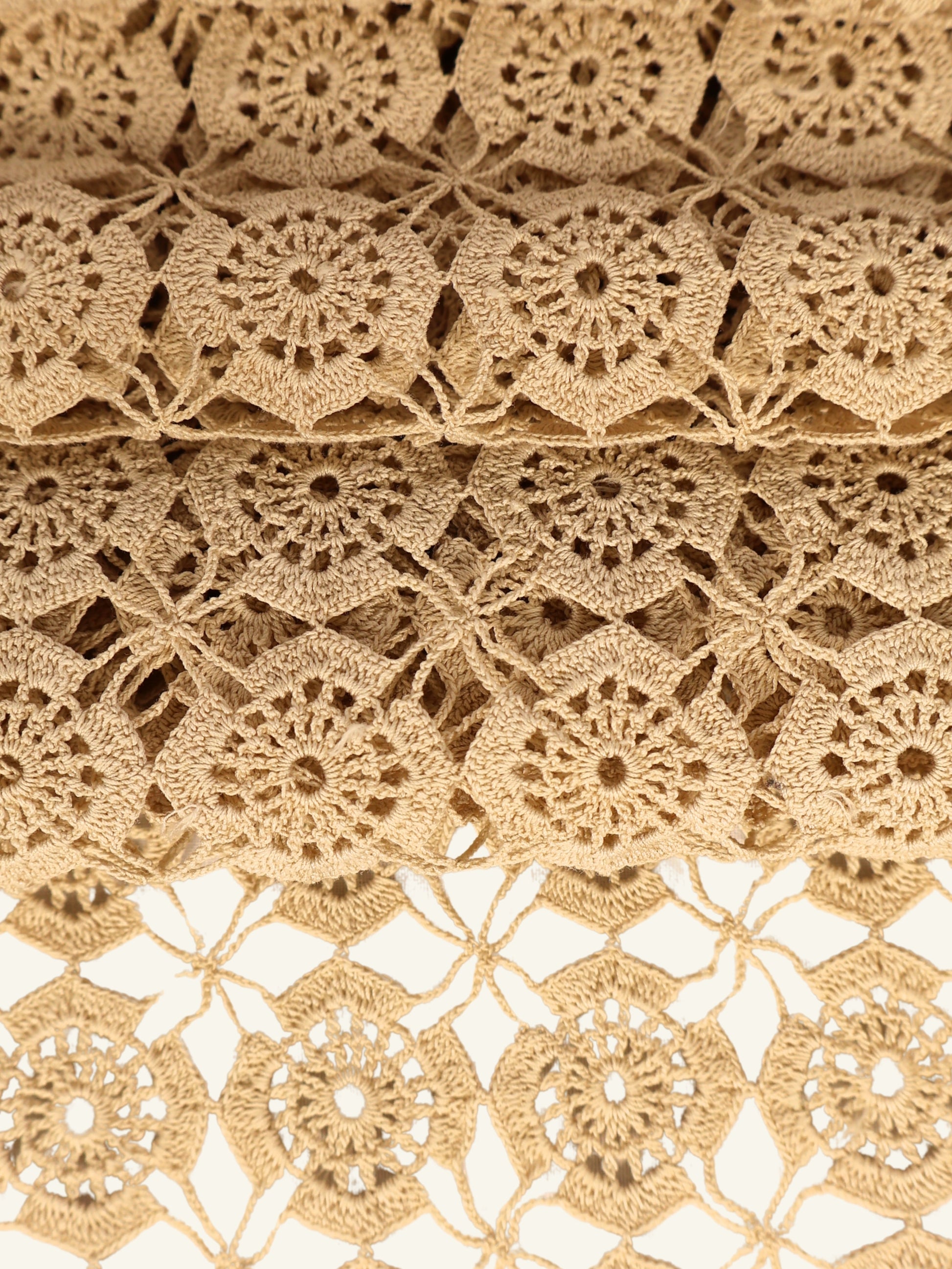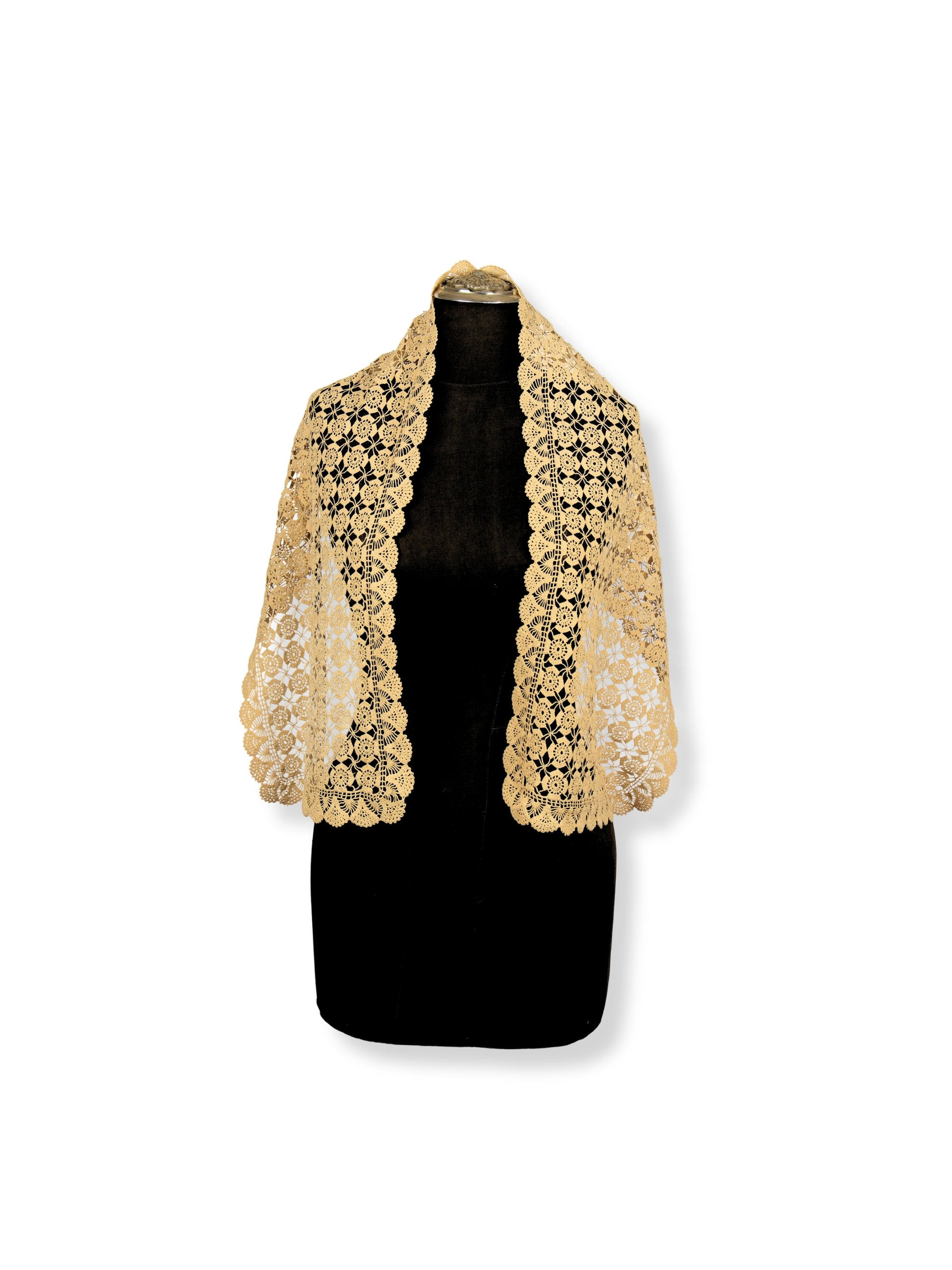 Ana eseri oluşturan el örgüsü dantel, kenarlarında yer alan su yolu formundaki motiflerle zenginleştirilmiş; böylece hem geleneksel el işçiliği korunmuş hem de zamansız bir şıklık elde edilmiştir.