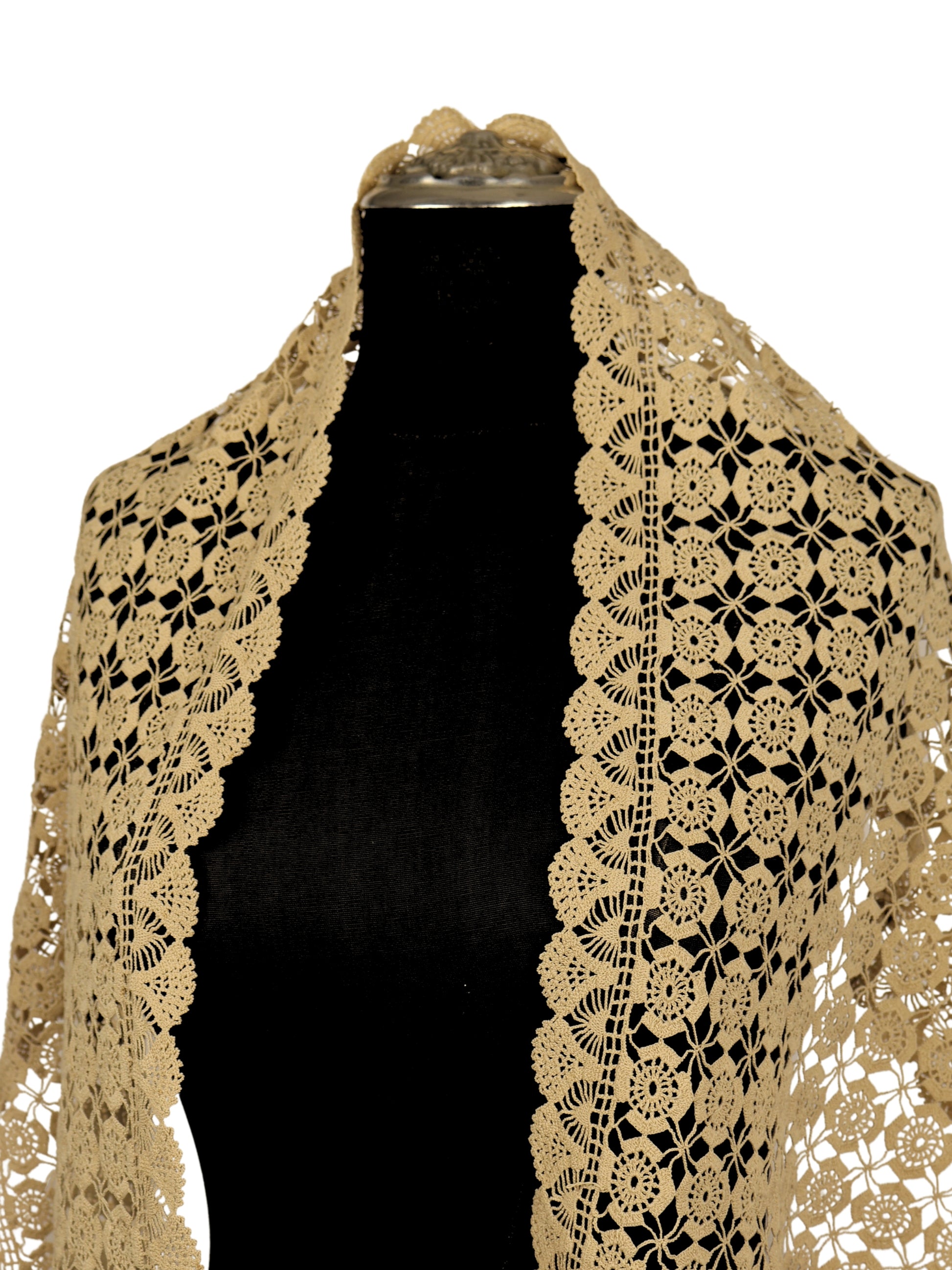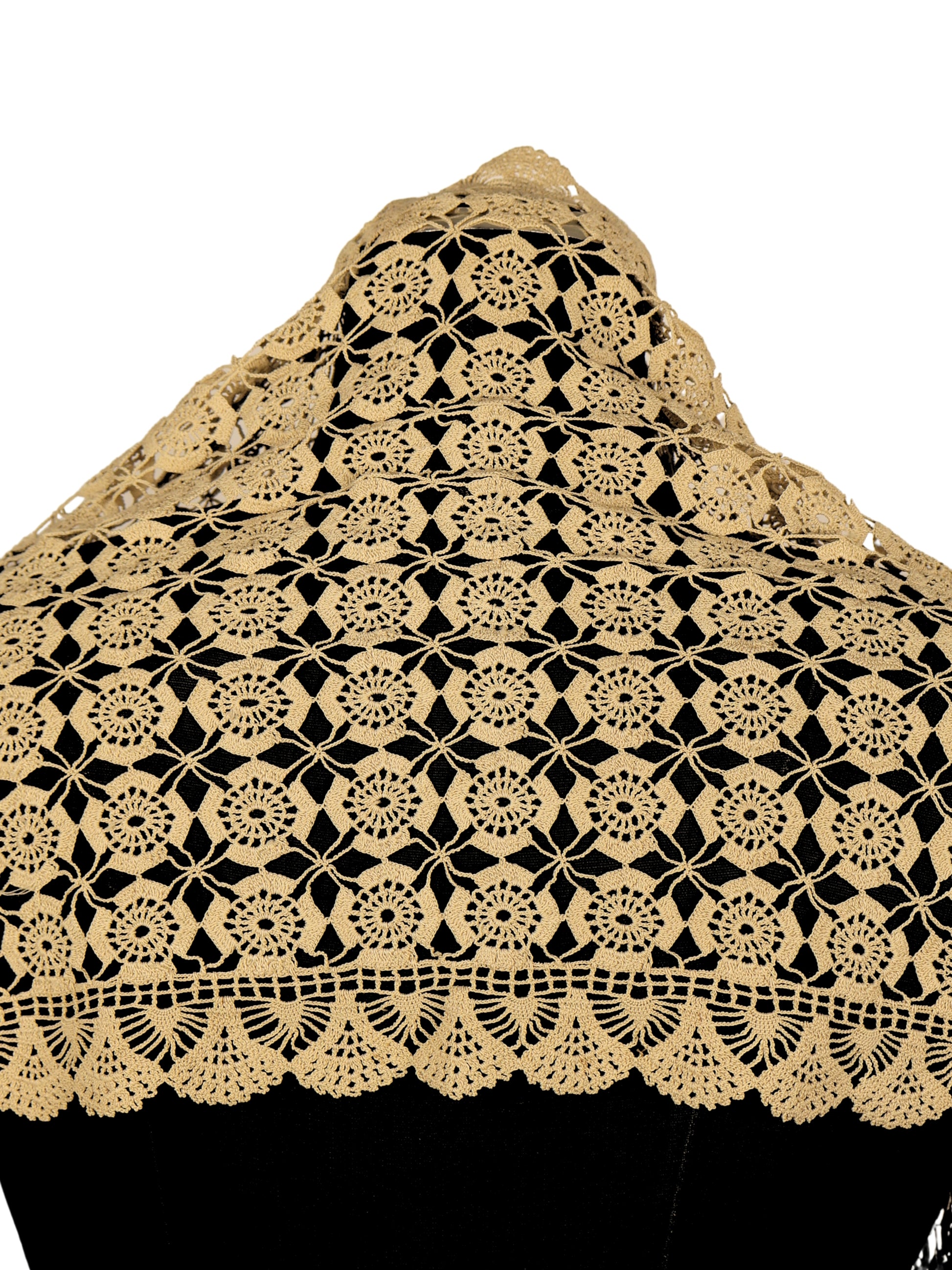 1971 yılında ekru renkli tığ ipiyle elde örülmüş, motif bütünlüğüne sahip dantel parça; yıllarca kullanılmadan korunmuş özgün bir sandık eseridir.