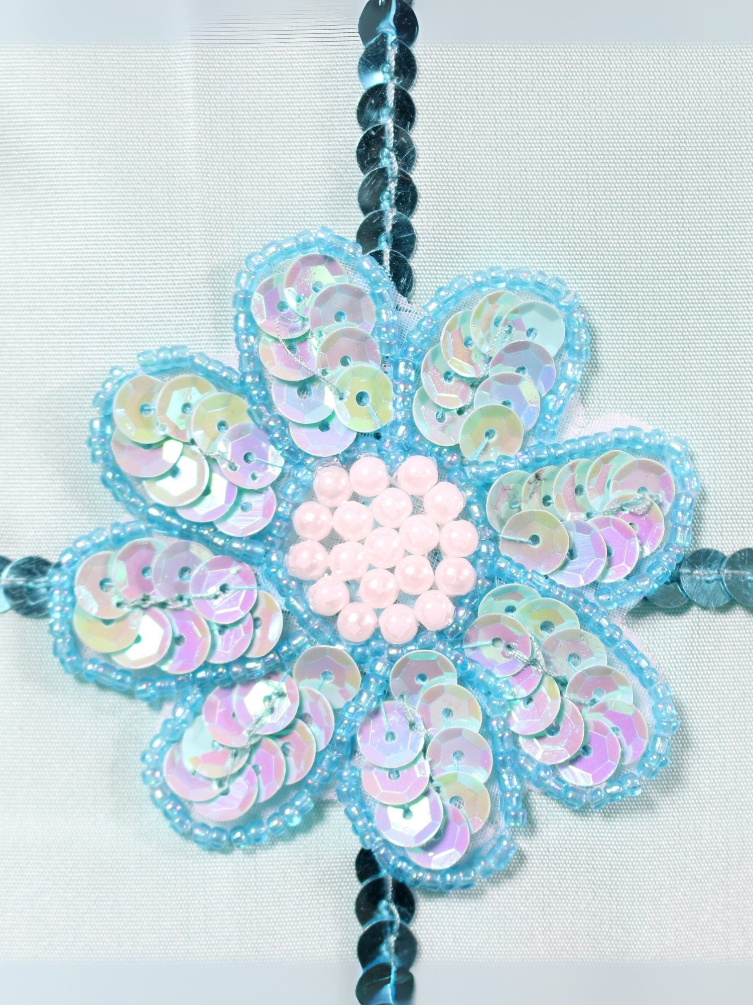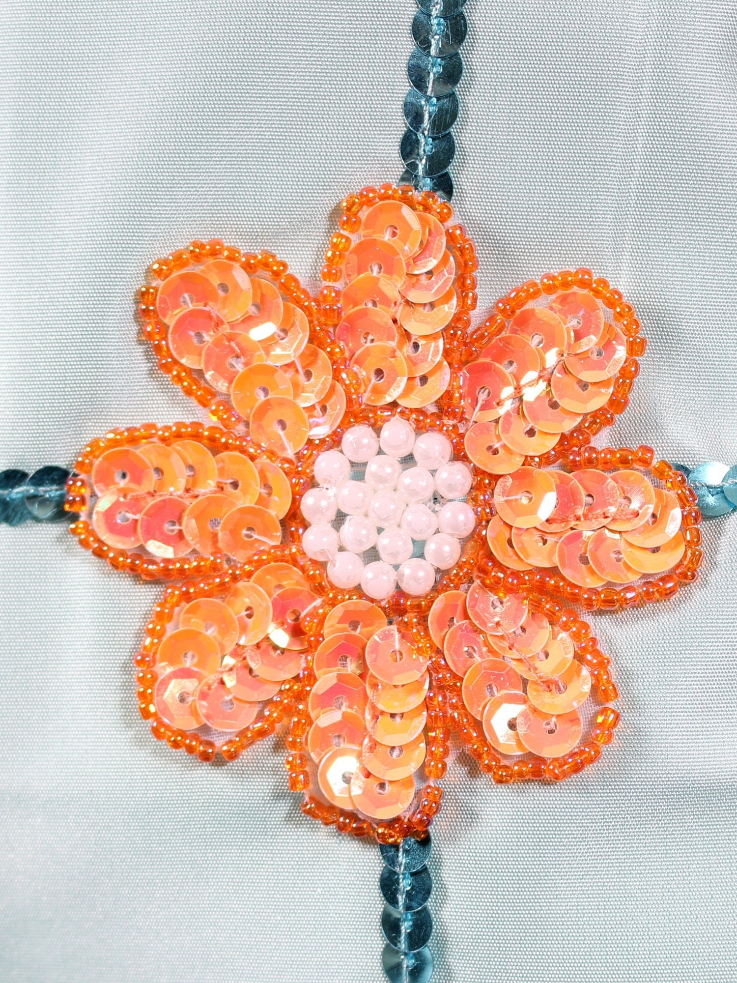 Turkuaz ipek tafta kumaş, renkli payetler, inci detaylar, fermuar