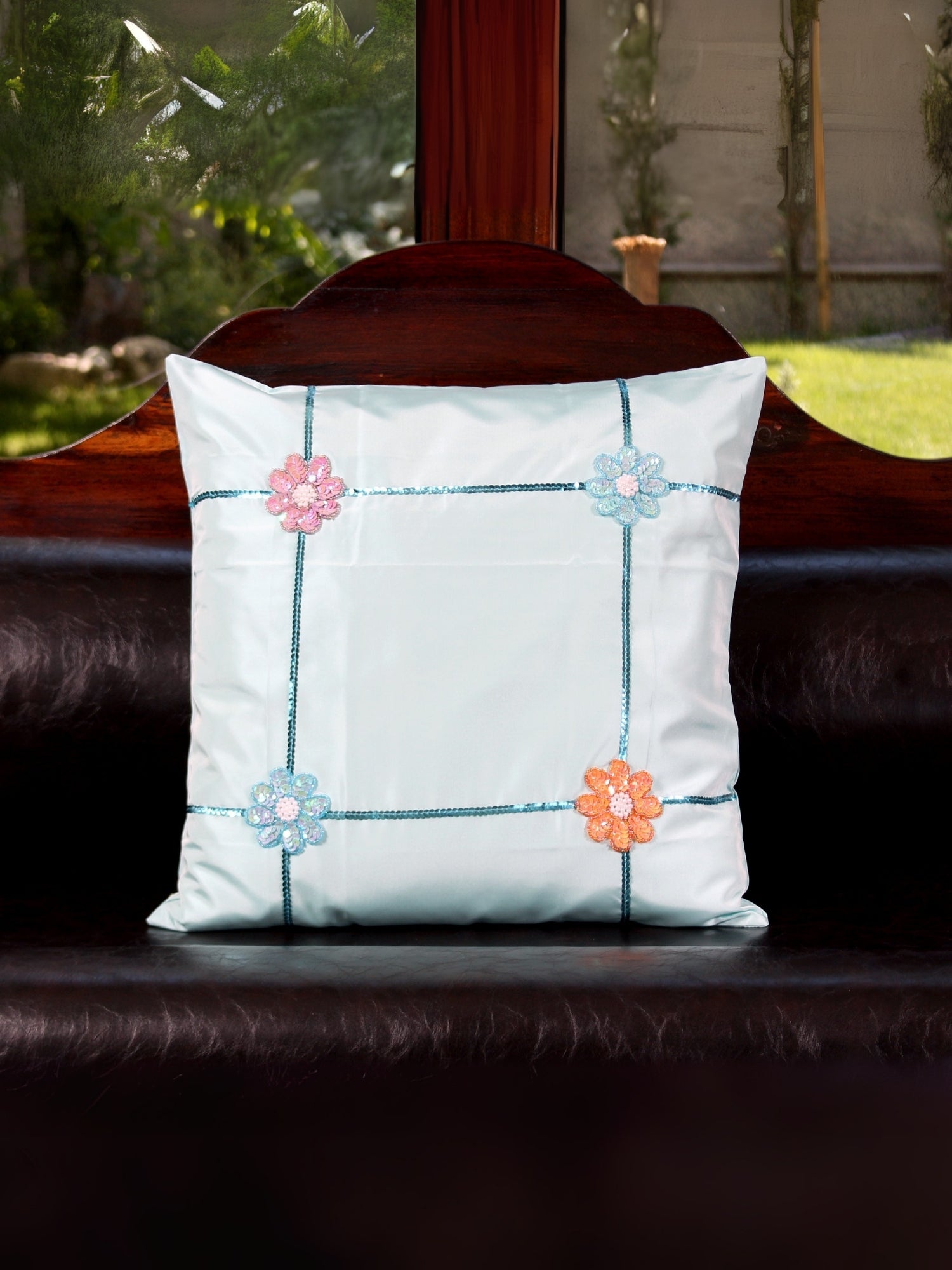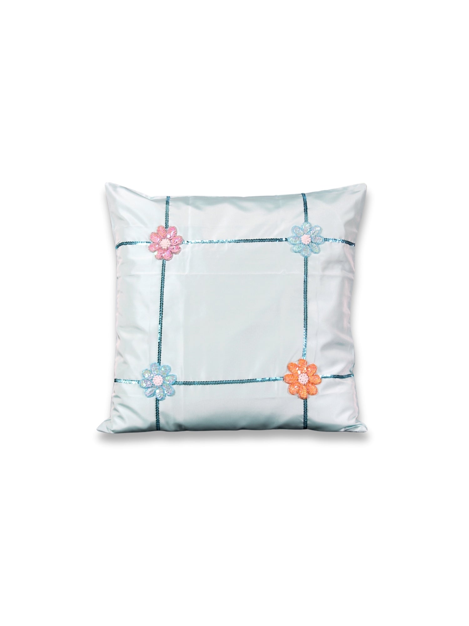 Turkuaz Çiçek – Renkli Payetli Çiçek Motifli İpek Tafta Kırlent Kılıfı
