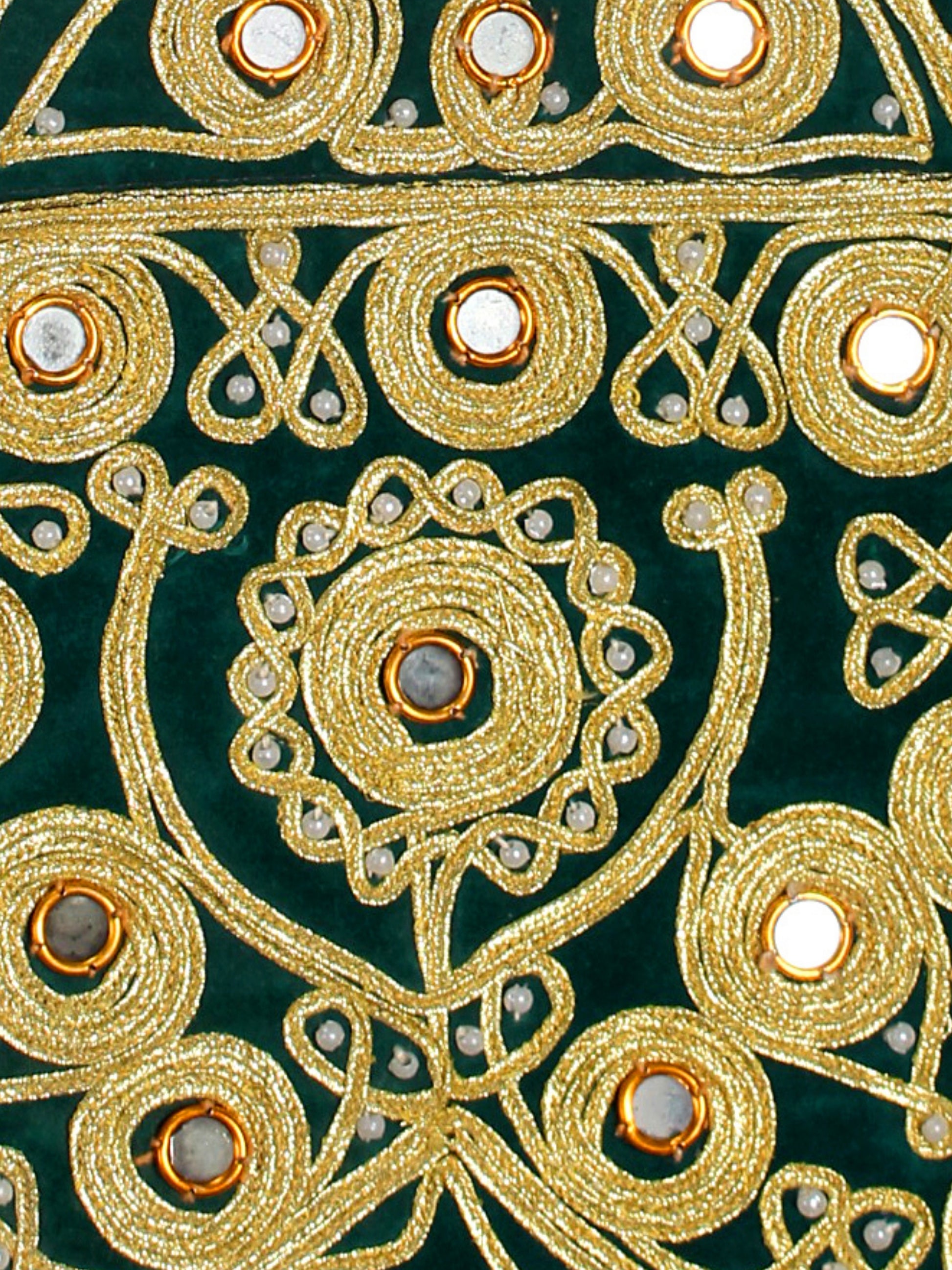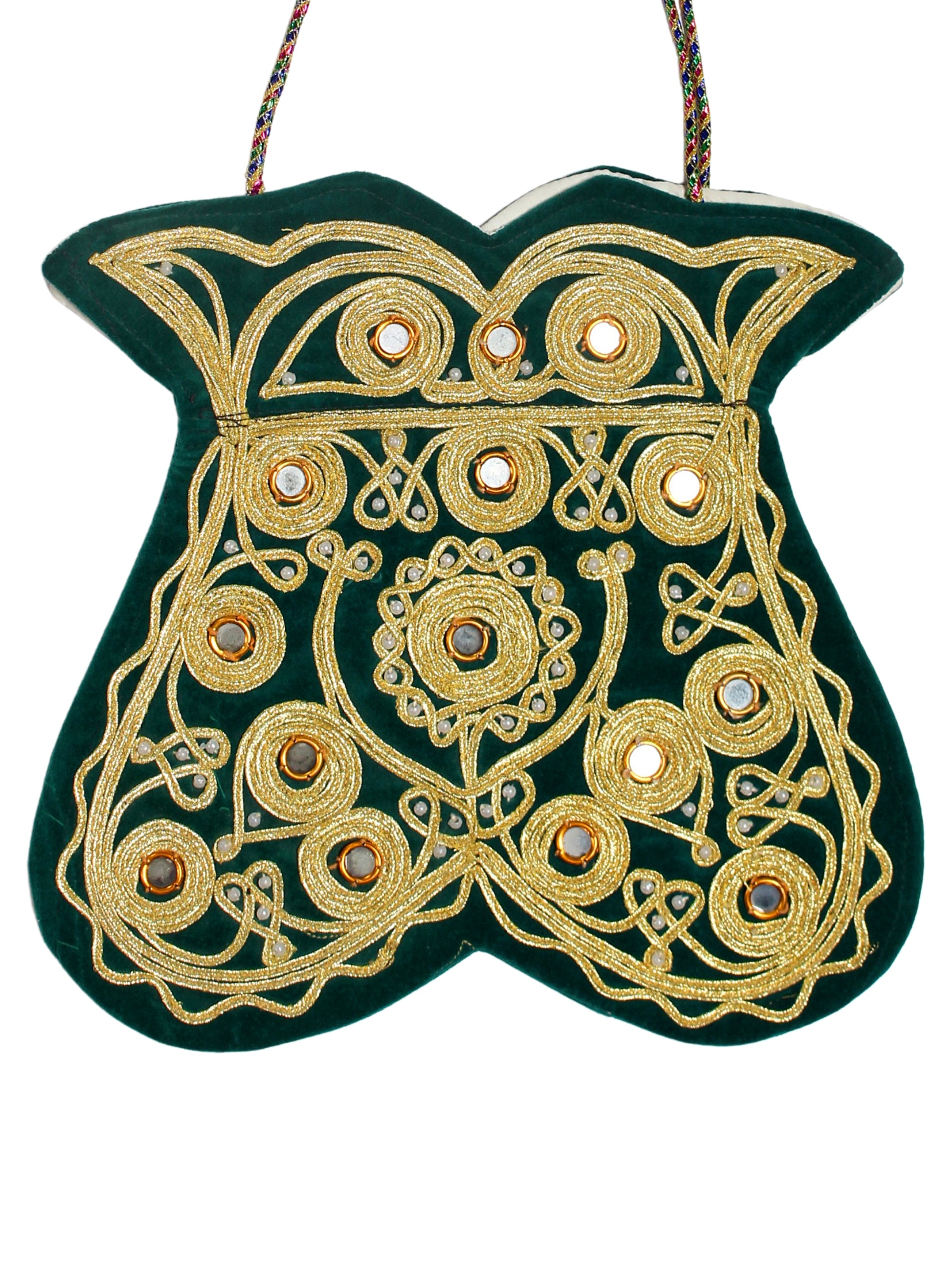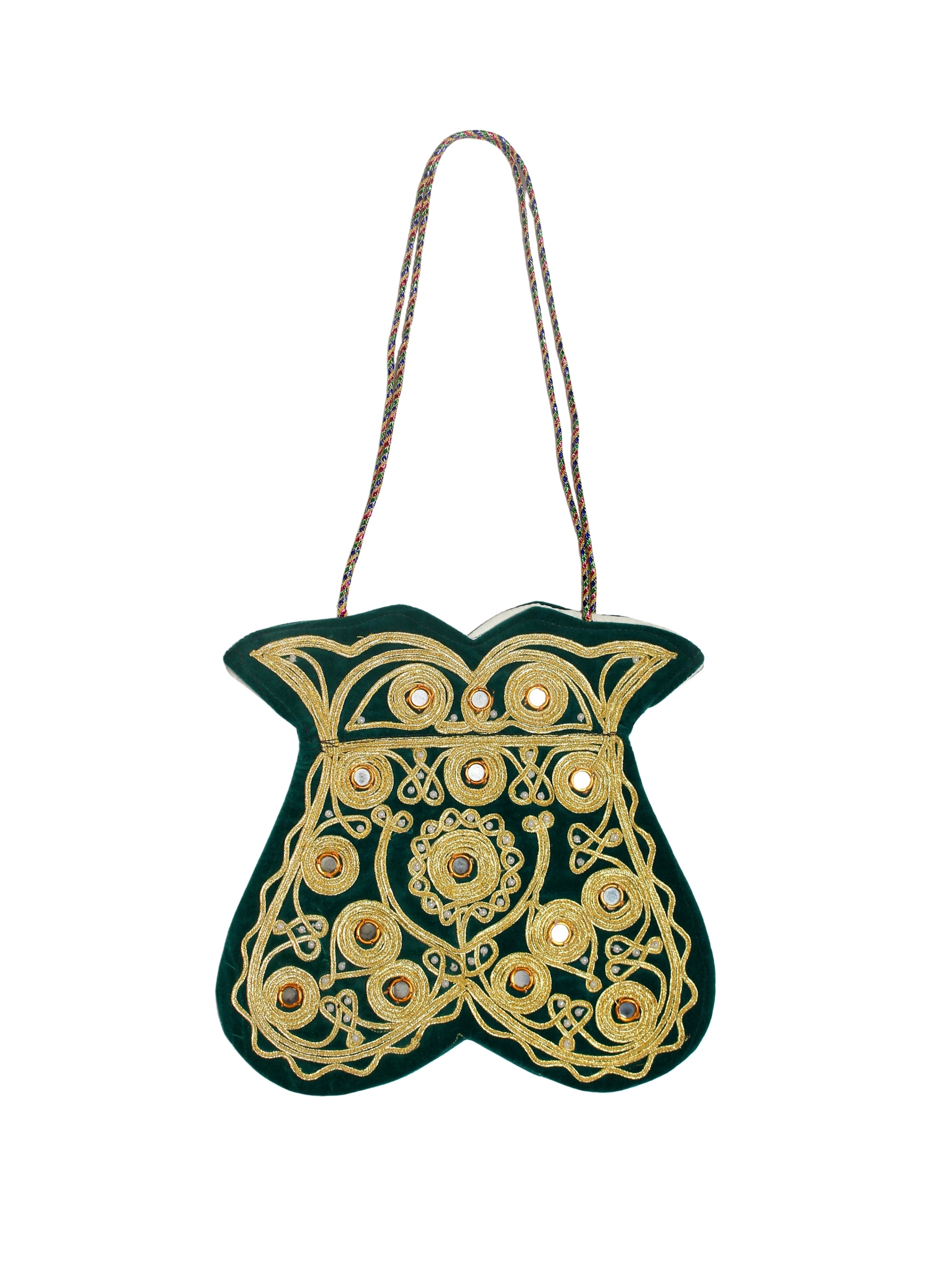 Zümrüt yeşili kadife üzerine altın sırma iplikle işlenmiş aynalı motiflerle bezeli, geleneksel formlu özgün bir çantadır. Floratlı detayları ve özel kesimiyle zarafeti temsil eder.